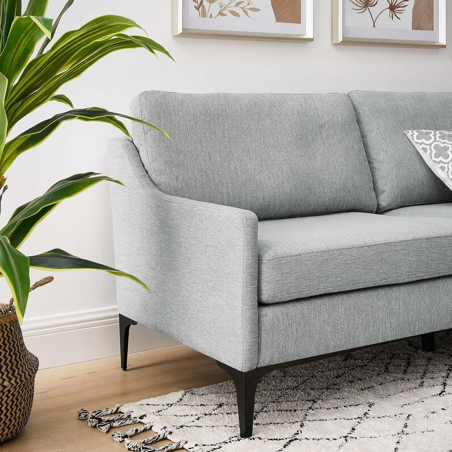 Create an atmosphere of balance and warmth in a living room, family room, entryway, or apartment with the relaxed sophistication of the Corland Upholstered Fabric Sofa. The cultured profile of this mid-century modern couch beckons with the complementing curves of the armrests and the pillowy back cushions rising above the back frame, adding softness and stature. Amply padded with dense foam, the seat cushions of this living room sofa are nestled between sleek, sloped armrests flowing into black powder-coated metal legs with non-marking foot caps. This upholstered sofa is well-crafted on a sturdy plywood frame with a superior spring coil support system and tailored in soft and durable polyester fabric bringing high-performing design integrity into your home office or library. Corland is shipped in a convenient, easy-to-maneuver box with easy assembly instructions. Cushions are zippered and removable. Weight Capacity: 992 lbs.
