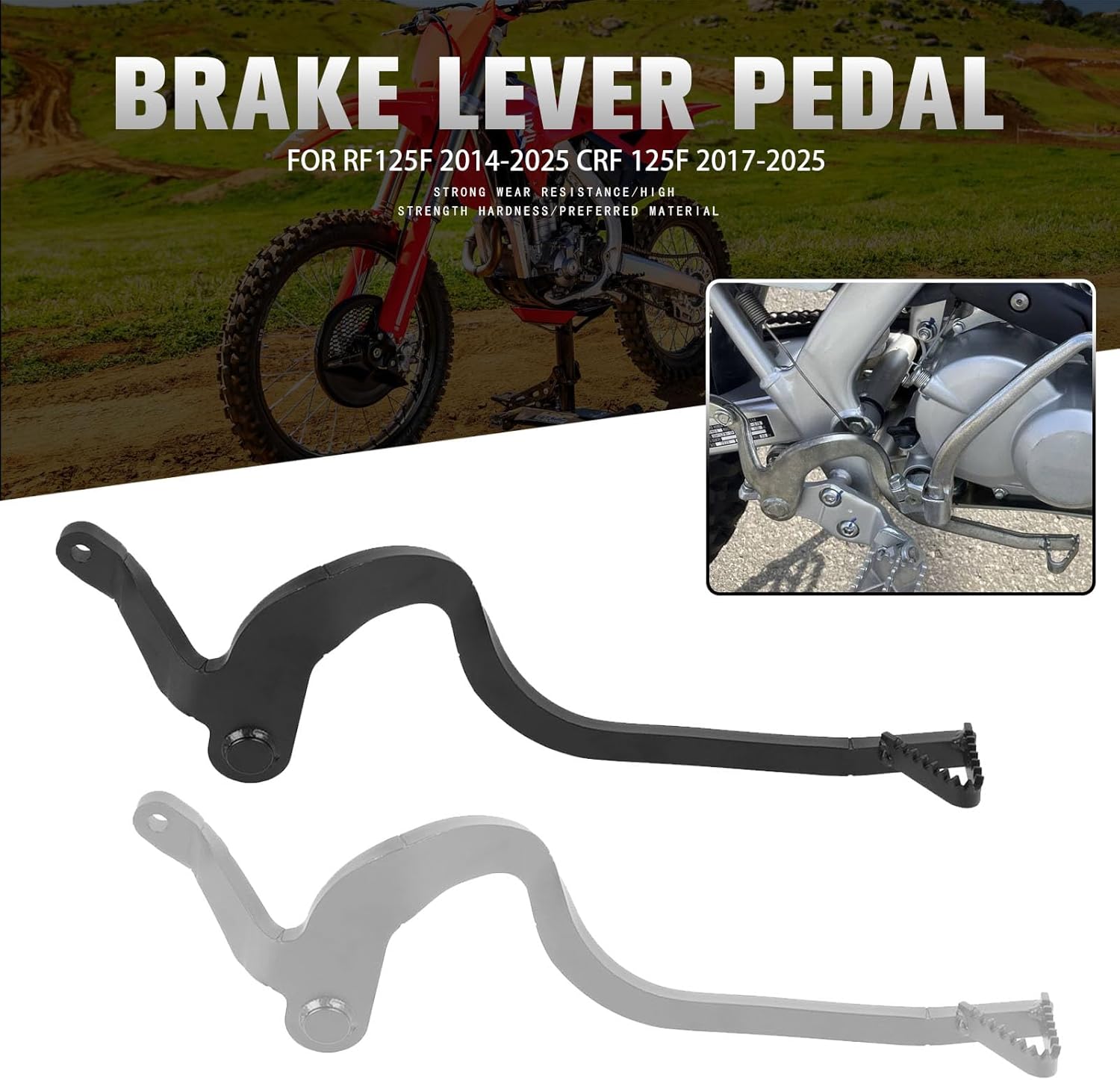 Color: Black & SliverLength: 330mm/12.9 inchPackage Includes: 1 x Aluminium Foot Pedal.Material: High Tensile Strength Aluminum ConstructionFitment:Replacement for Honda CRF125F 2014-2025 Brake LeversReplacement for Honda CRF 125F(Big Wheel) 2017-2025 Brake LeversFeature:Easy to install, installation instructions not included;When the vehicle falls down, it can rebound to protect the gear lever from breaking;Brake pedal pad with a unique pattern that is anti-slip, making your brakes safer and faster;Made of high strength and high tensile strength aluminum construction, which is wear resistant, not easy to break,high class quality and very long-lasting;