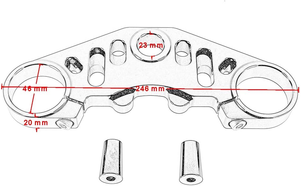 Motorcycle top triple clamp Increases the rigidity of your forks, improves suspension and reduces front fork flex Provides your motorcycle front end with a great look Made of billet 6061 aluminum, durable but light in weight 5 colors available for you to choose from Condition: new Material: CNC aluminum Color: black, blue, gold, red, titanium Quantity: 1 piece Fitment: For Yamaha YZF R15 V3 2017-2019