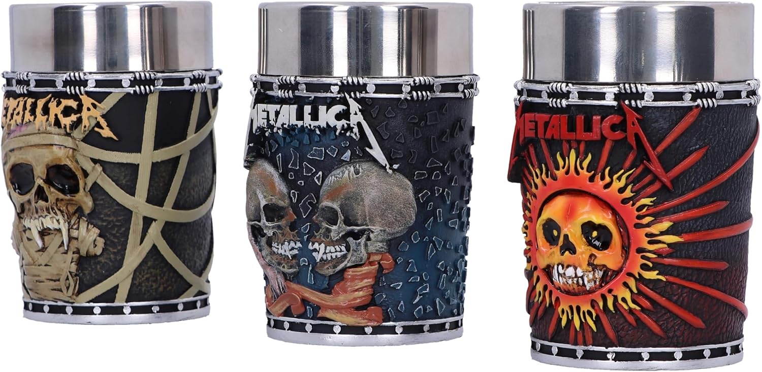 Have your favourite Metallica artwork on display at all times with this officially licensed Metallica Shot Glass Set. Each of the three shot cups features artwork which will be instantly recognisable to any Metal Militia Member, one inspired by the bands 'Summer Shit '94' Tour, another by their 'Sad But True' Song, and lastly their Song 'One'. All three shot glasses come neatly packed in an epic gift box, and are cast in the finest resin before being painstakingly hand-painted. Perfect for any Metallica fan!