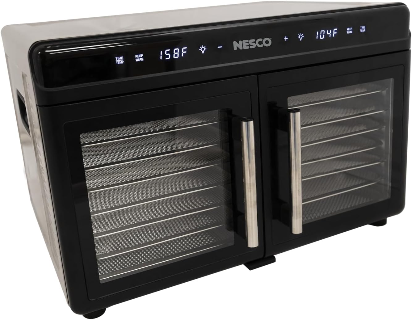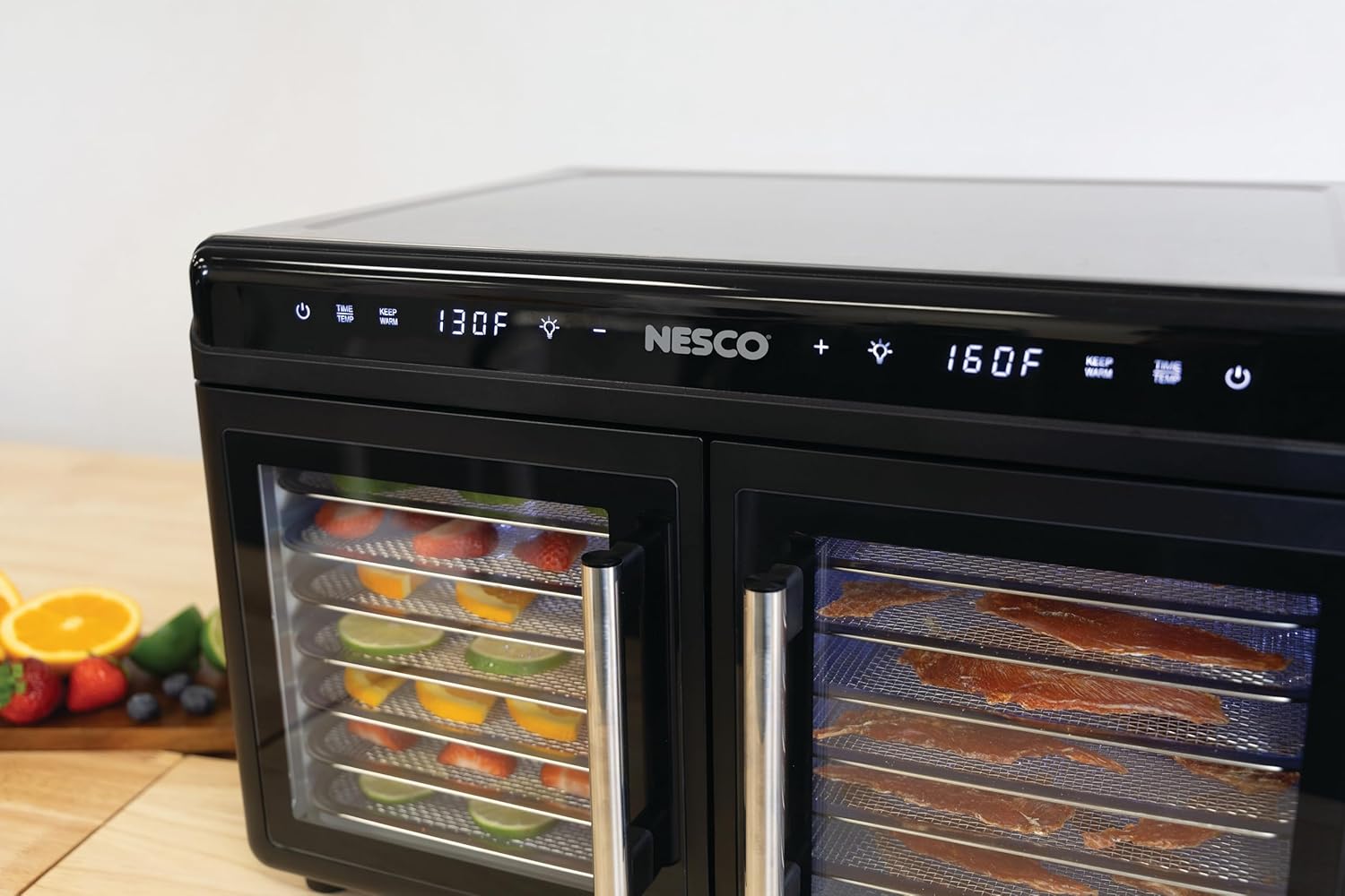 The NESCO FD-16DZD Dual-Zone Food Dehydrator offers powerful, flexible food drying with two independently controlled drying chambers—perfect for making jerky, fruit snacks, herbs, and pet treats simultaneously without flavor crossover. Each zone features 8 stainless steel trays (16 total), plus a mesh sheet and drip tray for easy cleanup and drying variety. The adjustable digital timer ranges from 1 to 24 hours (in 30-minute intervals), and the temperature can be set between 95°F and 160°F in 5°F increments for precise drying of all food types. With rear-mounted heating and fans in each zone, this dehydrator ensures even, consistent airflow on every tray—no rotation needed. The stainless steel housing, interior light, and easy-open handle door design offer both style and convenience. With 1200 watts of drying power and BPA-free components, the FD-16DZD is ideal for serious home dehydrating, meal prep, and food preservation.