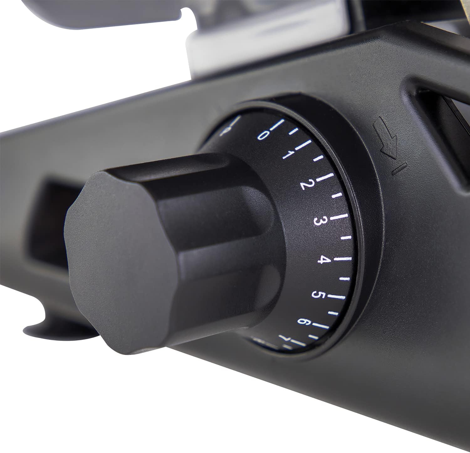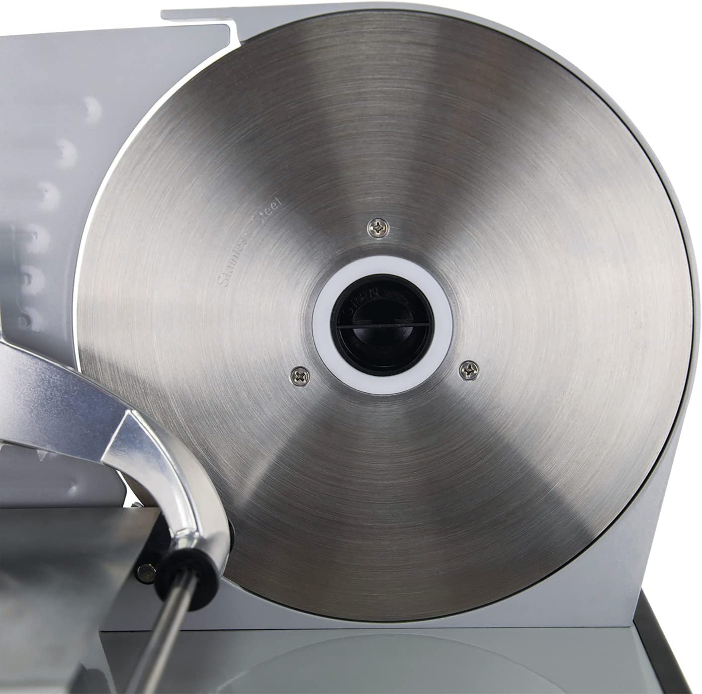 The NESCO FS-300 Professional 8.7" Food Slicer is designed to provide professional performance that is powerful enough for any job. The quiet DC motor provides the power to slice and can handle a wide range of food sizes and shapes. The easy-glide food carriage accepts large cuts of meat, while the food guide prevents food from shifting and protects the user while slicing. Slice meat, cheese, bread, and vegetables quickly and easily. The quick release glide bar and center blade lock allow the user to remove the food carriage and blade for easy clean up. The 8.7-inch stainless steel non-serrated blade and thickness control knob provide consistent slices every time. Accurately choose the cut depth from deli thin to 9/16 inch thick. A recessed power switch ensures safe use and helps eliminate accidental engagement while non-slip feet provide a stable base on most surfaces. Designed for elegance and high performance so you can skip the deli line, the NESCO FS-300 Professional 8.7" Food Slicer makes a great addition to any kitchen.