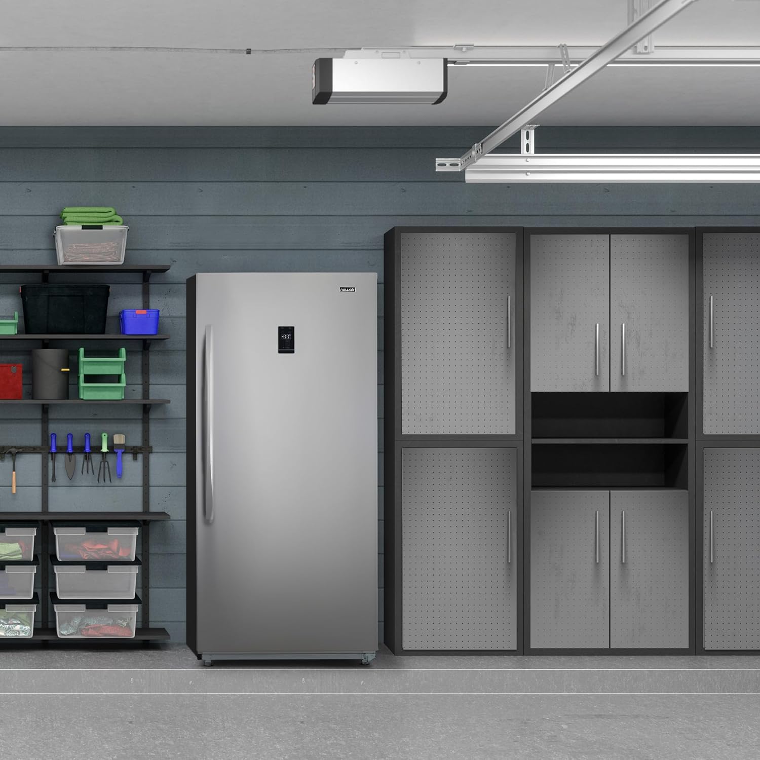 "The Newair® Upright Freezer, 13.8 Cu. Ft., is a high-capacity, space-efficient stand up freezer designed for homes, garages, basements, and commercial environments that need reliable frozen storage with easy access. Ideal for anyone searching for a garage freezer, large upright freezer, or freezer for bulk food storage, this model delivers powerful performance while minimizing floor space compared to traditional chest freezers. Engineered with a garage-ready design, this upright freezer operates dependably in ambient temperatures ranging from 32°F to 110°F, making it well suited for garages, workshops, and utility areas. With 13.8 cubic feet of internal storage, it provides ample room for frozen meats, prepared meals, bulk groceries, and seasonal items while keeping everything organized and easy to reach. The intuitive digital control panel allows you to quickly set and adjust temperatures between -11°F and 46°F, enabling use as either a freezer or refrigerator depending on your needs. Whether you’re storing meat long-term or using it as overflow cold storage, this upright deep freezer offers precise control for optimal food preservation. Designed for convenience, this freezer features automatic defrost, eliminating the need for manual frost removal. Fast Freeze Mode rapidly lowers temperatures when new food is added, helping preserve texture, flavor, and nutrients. Interior LED lighting illuminates contents clearly, while door-open and high-temperature alerts provide added protection against accidental food loss. Quiet, efficient, and Energy Star certified, the Newair® Upright Freezer operates at just 41 dB and helps reduce energy costs without compromising performance. Finished in sleek stainless steel, this garage-ready upright freezer is a modern, dependable solution for anyone seeking a high-capacity freezer with organized storage and effortless maintenance.