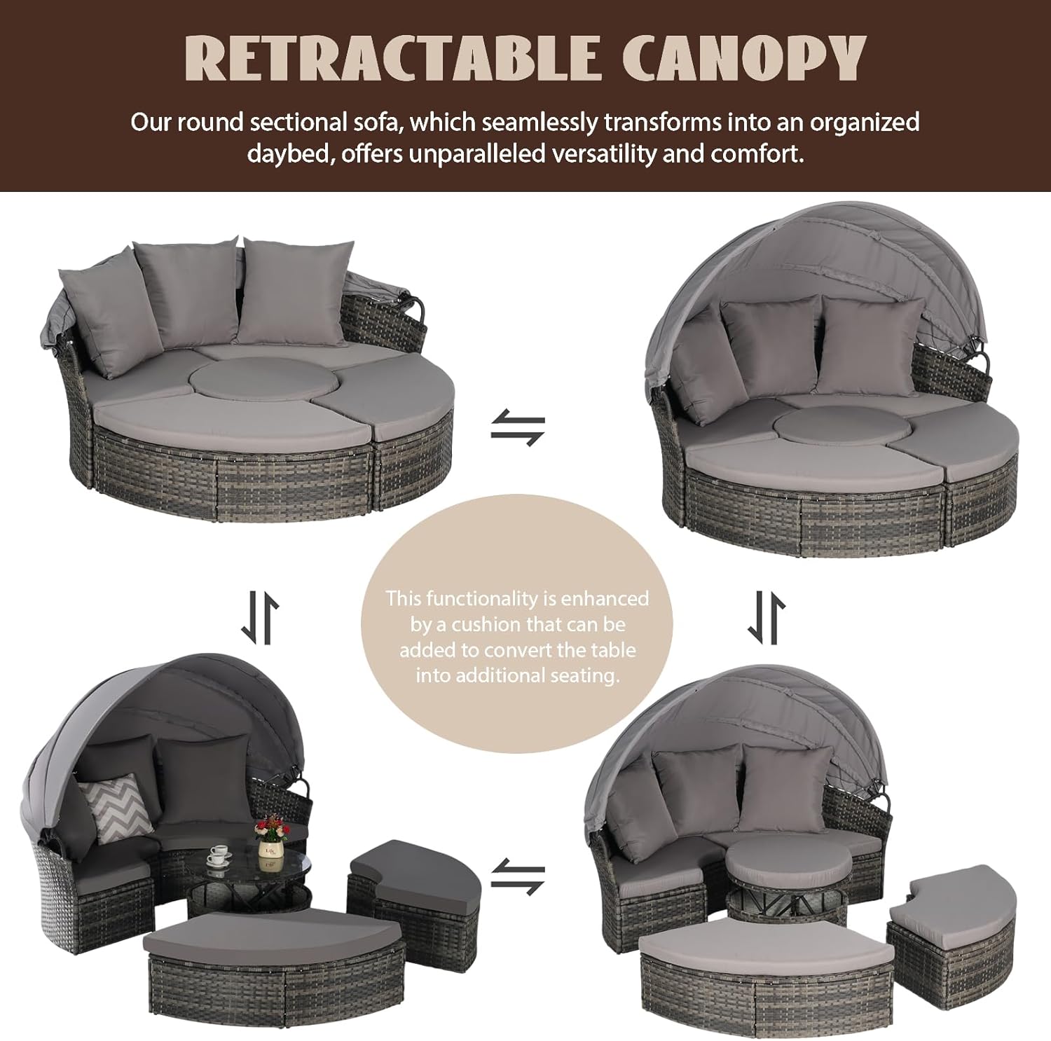 All-Weather PE Rattan // Metal Frame // Retractable Canopy // Round Sectional Sofa // Organized Daybed // Adjustable Table // Table w/ Cushion // Washable Covers Specifications Material: PE Rattan+Steel+Polyester Fabric+Foam Pieces Included: Sofa + Canopy + 2 Ottomans + 1 Coffee Table Color: Light Gray/Dark Gray/Beige/Dark Blue/Light Blue Assembly Required: Yes Additional Tools Required: All Tools Included Country of Origin: China Notice Color Notice: Items may slightly differ from photo in terms of color due to the lighting or your monitor's display. Size Notice: Manual measurement has been used, there may be some reasonable error.