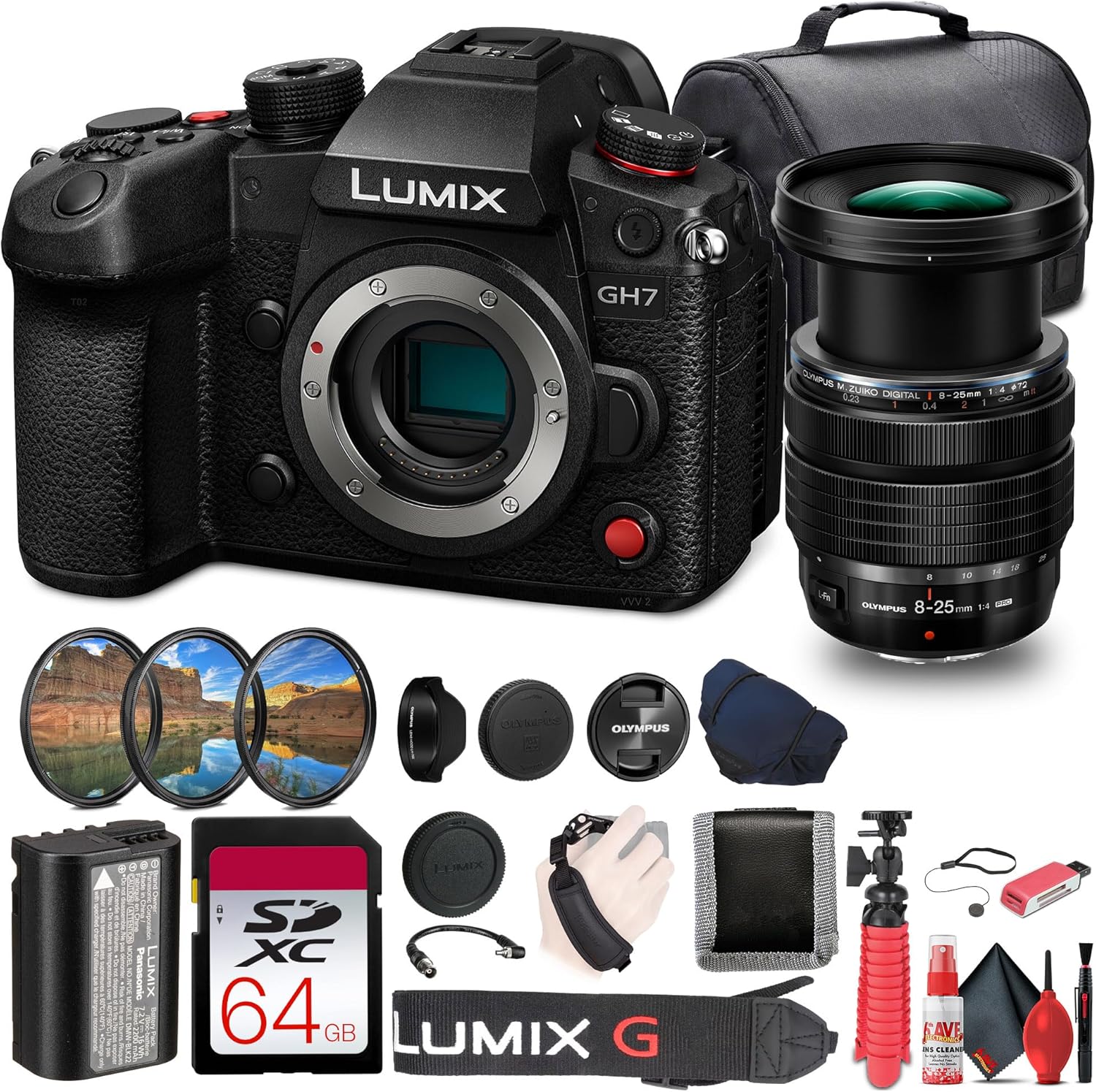 Capture the world with precision and creativity using the Panasonic Lumix GH7 Mirrorless Camera with 12-60mm f/2.8-4 Lens. This versatile camera is designed for photographers and videographers who demand high-quality results and flexibility in their work. At the heart of the Lumix GH7 is a25.2MP BSI CMOS Micro Four Thirds Sensor that delivers sharp, detailed images with rich color and dynamic range. Whether you're shooting landscapes, portraits, or action scenes, this camera ensures exceptional clarity and realism in every shot. The sensor is complemented by Panasonic's advanced Venus Engine processor, which provides fast performance, accurate color reproduction, and excellent noise reduction, even in low-light conditions. The included 12-60mm f/2.8-4 lens offers a versatile zoom range, perfect for capturing everything from wide-angle landscapes to close-up portraits. The bright aperture range of f/2.8-4 allows for beautiful background blur (bokeh) and effective low-light shooting, giving you creative control over your images. With optical image stabilization built into the lens, you can achieve steady, blur-free photos and videos, even when shooting handheld.Manufacturer Included Items:Panasonic Lumix GH7 Mirrorless Camera Panasonic DMW-BLK22 Battery Battery Charger BNC Conversion Cable Shoulder Strap Body Cap Eye Cup Hot Shoe Cover Flash Socket CapBundle Items Include:Panasonic Lumix GH7 Mirrorless Micro Four Thirds CameraOlympus M.Zuiko Digital ED 40-150mm f/4-5.6 R Lens64GB Memory CardSoft BagDMW-BLK22 Lithium-Ion Replacement BatteryMemory Card ReaderExternal ChargerFilter Kit12 inch Flexible TripodPhoto Editing SoftwareCleaning KitMemory Card WalletHand StrapLens Cap Keeper