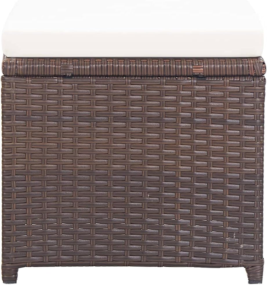 This set of 2 stools, with neat and modern design, will be an understated and practical addition in your garden, terrace or on your patio.The low-maintenance construction, made from powder-coated steel and poly rattan, ensures it sturdiness and durability and can withstand tear and wear. The thick cushions will enhance your seating comfort. Thanks to its height, the garden stools are also versatile as footrests.Treat yourself to a time-out no matter sitting or putting your feet up on this comfortable rattan stool. Delivery includes 2 stools with cushions.Color: Brown + cream white (cushion)Stool material: Poly rattan + powder-coated steelCushion material: 100% PolyesterCushion thickness: 2"Dimensions: 16.1" x 16.1" x 13.8" (L x W x H)Delivery includes 2 stools