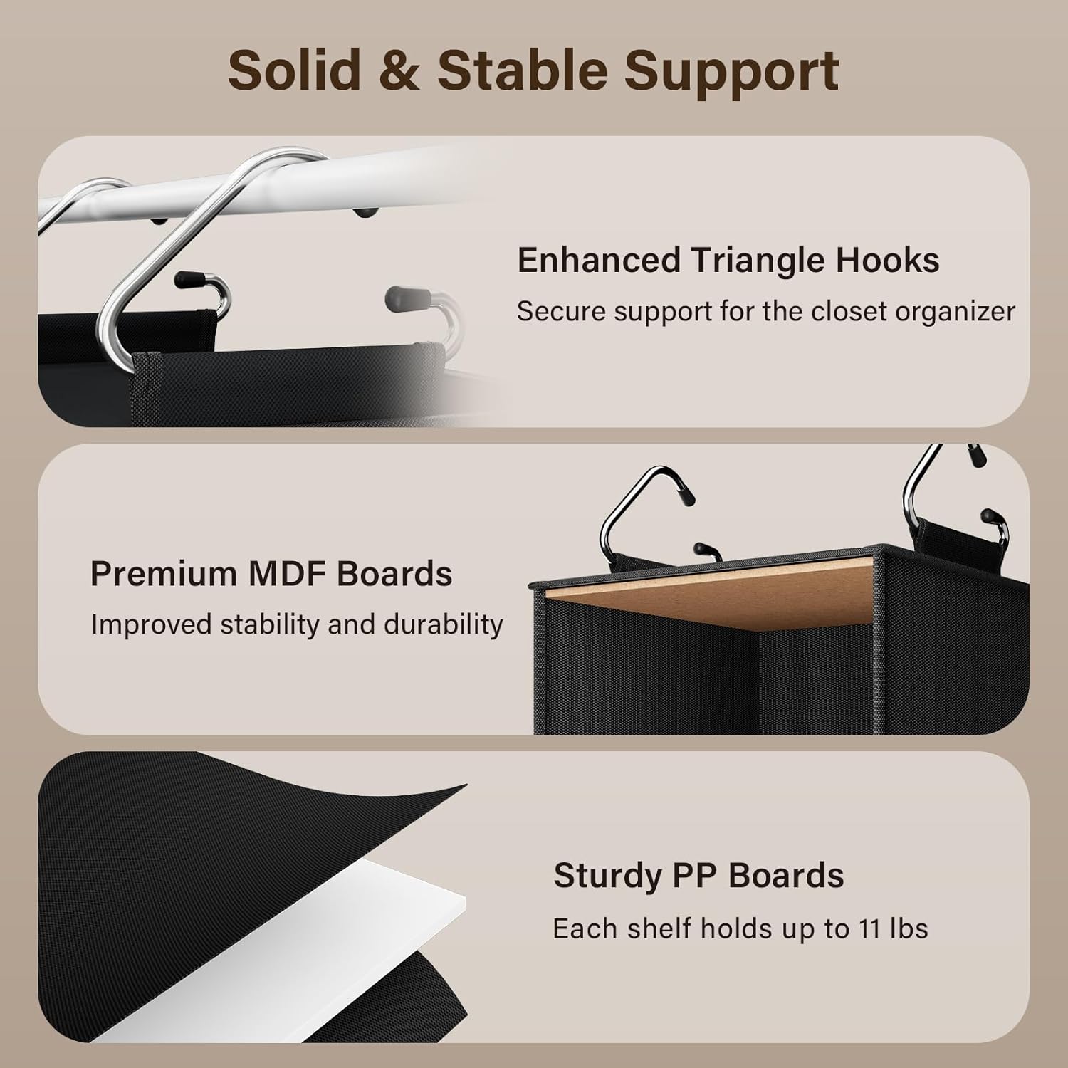 • Extra Strong & Stable: Featuring high-quality non-woven fabric with sturdy polypropylene support boards in the middle, this closet hanging organizer holds up to 40 lbs without deformation. Each shelf can hold up to 11 lbs. Premium MDF boards in the top and bottom and enhanced triangle hooks ensure stability for your storage space.