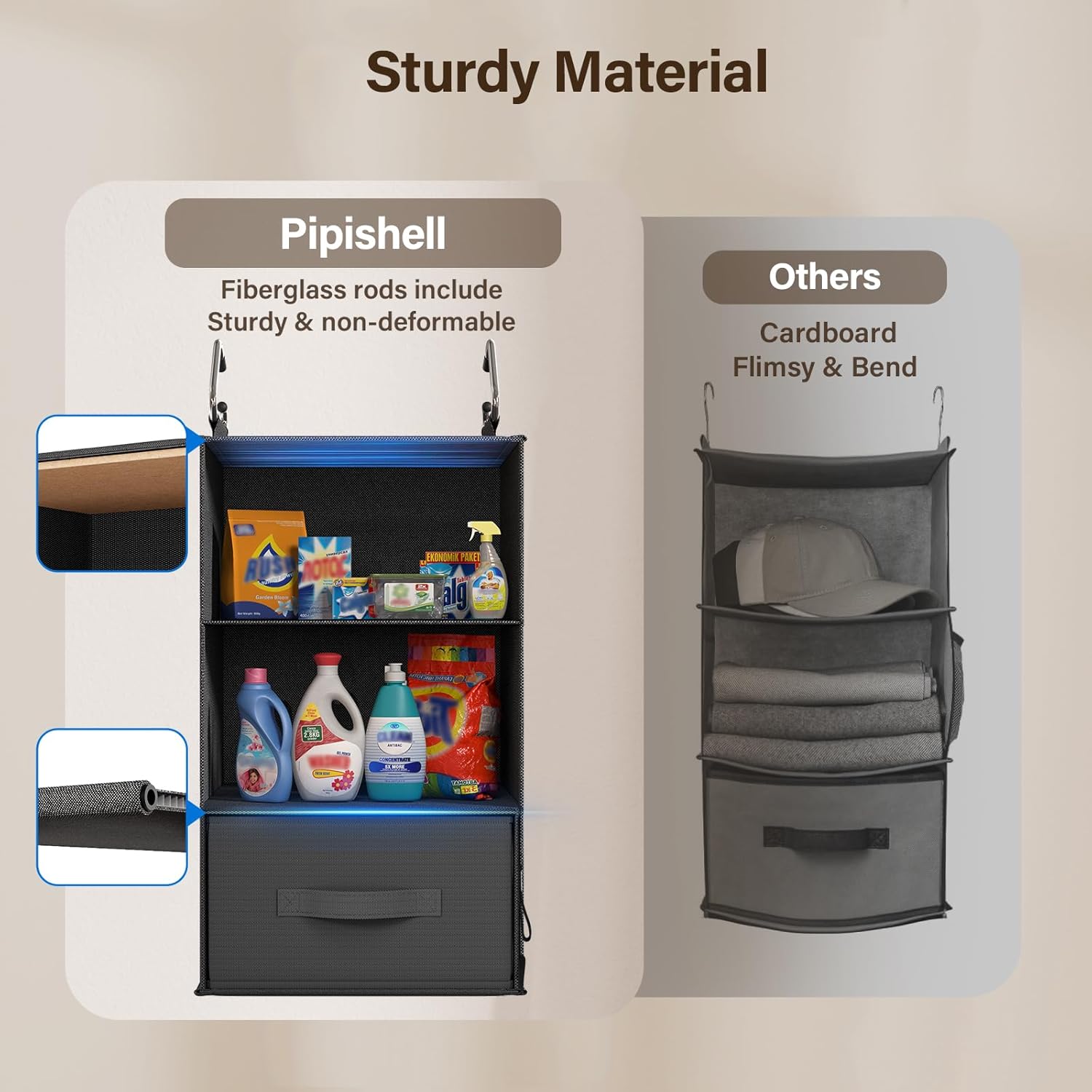 • Extra Storage Features: The hanging storage closet shelf is designed with 4 side pockets and 3 removable drawers to store small everyday items including socks or underwear. One drawer of the hanging shelf organizer features 12 compartments for additional organization.