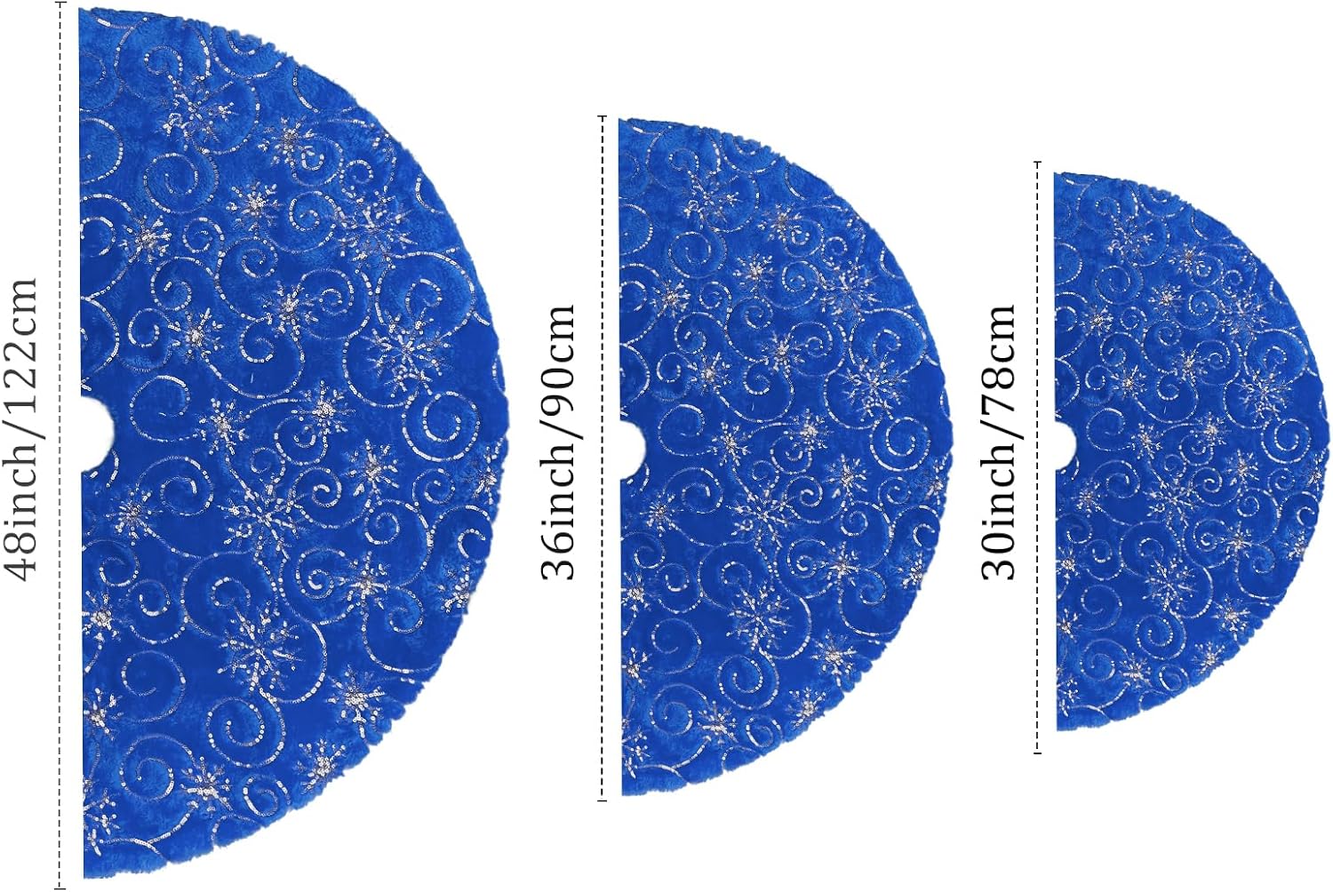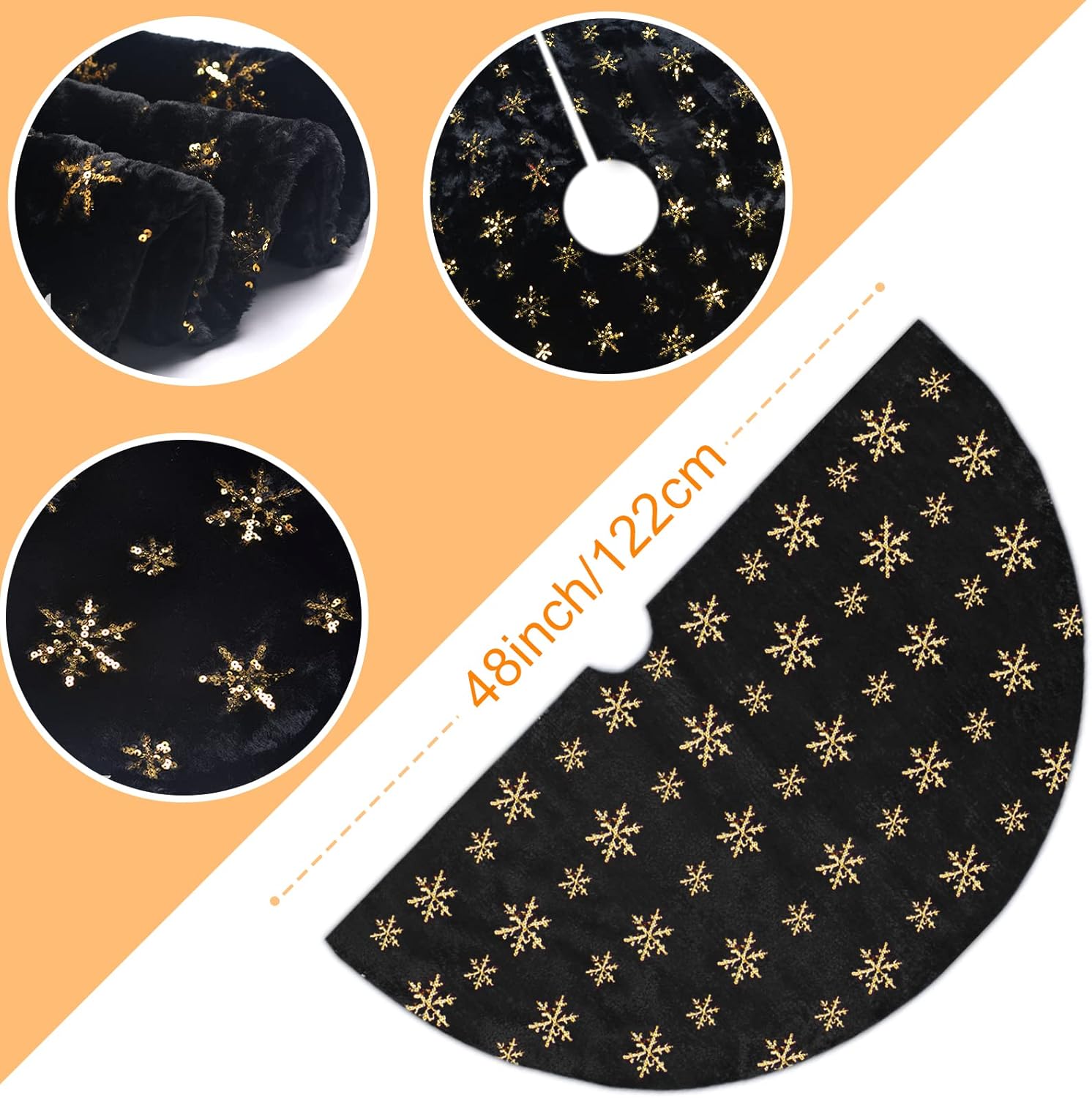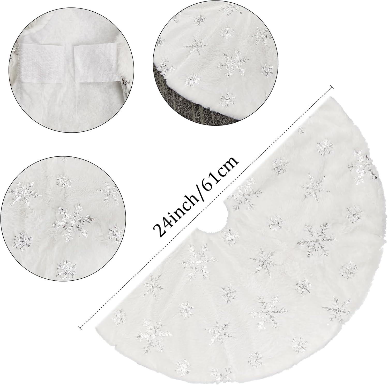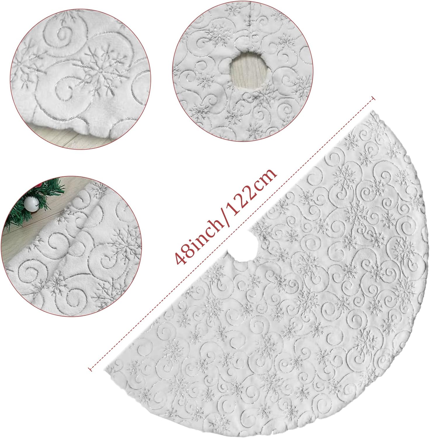 Merry Christmas to everyone. Perfect for Christmas tree decoration, creating an enchanting Christmas holiday wonderland and party joyous atmosphere and beautiful holiday memories. Makes the perfect Gift for family and friends! Features: 1. Color: Snowy White + Silver Sequin Snowflakes 2. Material: Faux Fur + Sequin Embroidery 3. Diameter: 57 inches (145cm), perfect for any size tree from 5' small to 7' large trees. 4. Soft and warm, the favorite spot for pets in winter, adds Christmas feel to your home. 5. Thick and soft, well made and will last for years to dress your tree, reusable for years and years 6. Make a wonderful decorations for your Christmas Tree at home, school, store, office, supermarket, etc. Note: 1. You can fold it up to store if not needed. 2. Hand Wash in cold water and air dry preferred. 3. Please allow a little bit of size deviation due to manual measurement. How to choose the right size about the tree skirt? 1. Measure the space occupied by the skirt to determine the maximum size that can be accommodated in the area. 2. Look for skirts that are roughly the same diameter as the most wide span of a tree. 3. To perfectly decorate your tree, we recommend that the diameter of the tree skirt is at least 3 inches larger than the entire width of the tree.