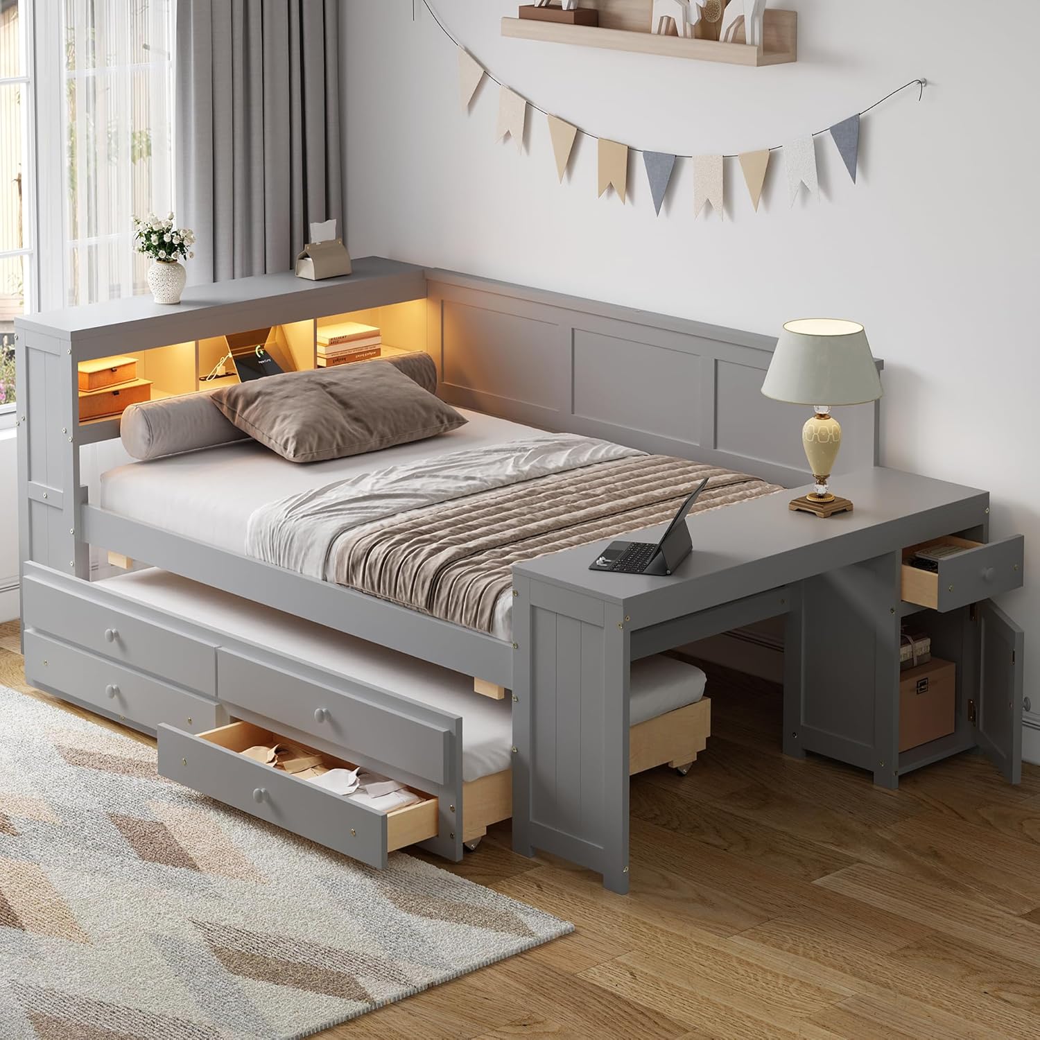 | Included Components | Built-in Desk, Storage Shelves, Drawers & Cabinet, Trundle |