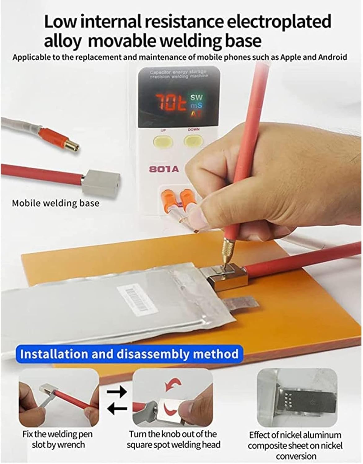 Product ParametersPower Adapter Input AC 100-240 V 50/60 HzPower Adapter Output 15 V 1.3 AMachine Input DC 15 V 1.3 AMachine Charging Time 20-30 minutesOutput Welding Voltage 5-5.8 VOutput Welding Current 500-2000 A(pulse)Maximum Welding Power 11.6 KWMaximum Welding Energy 60 JPulse Time 0.05-5 msWelding Power Adjustment Range 0-99 tWelding Mode AT(automatic welding mode)Pulse Delayed Time 20-50 msWelding Thickness of Nickel 0.05-0.3 mmNotice:1. Please use a wall socket to ensure stable power supply.2. Please adjust the pressure regulator to appropriate parameters to ensure the welding effect.