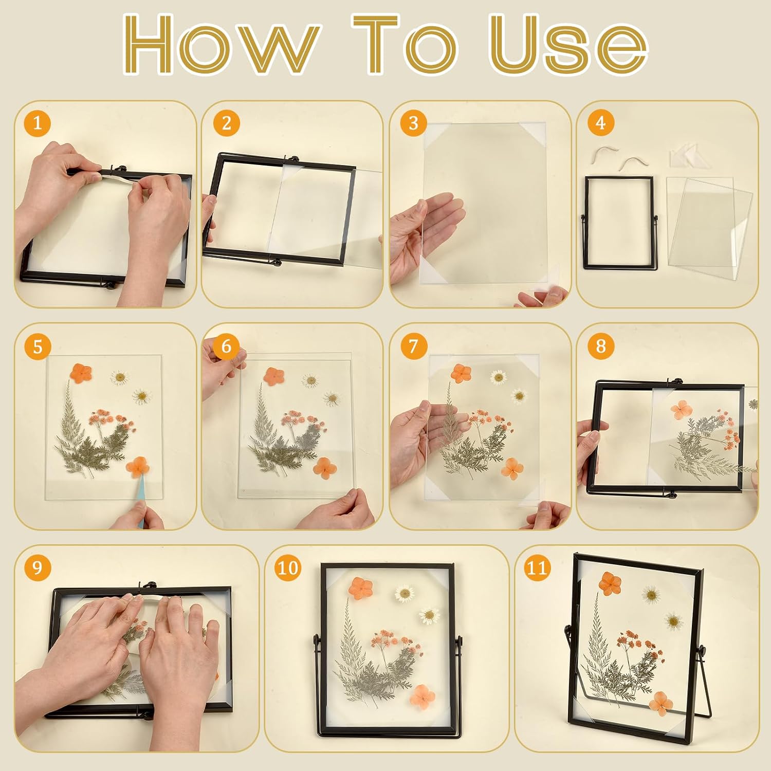 • ✔【How to Use】Remove the two backing clips, slide the glass out from the bottom, place dried flowers on the glass, reinsert the glass, then secure the clips. Includes a support bracket for freestanding use on tables or shelves. Experience the unique blend of old-world charm and modern elegance with our pressed flower frames.