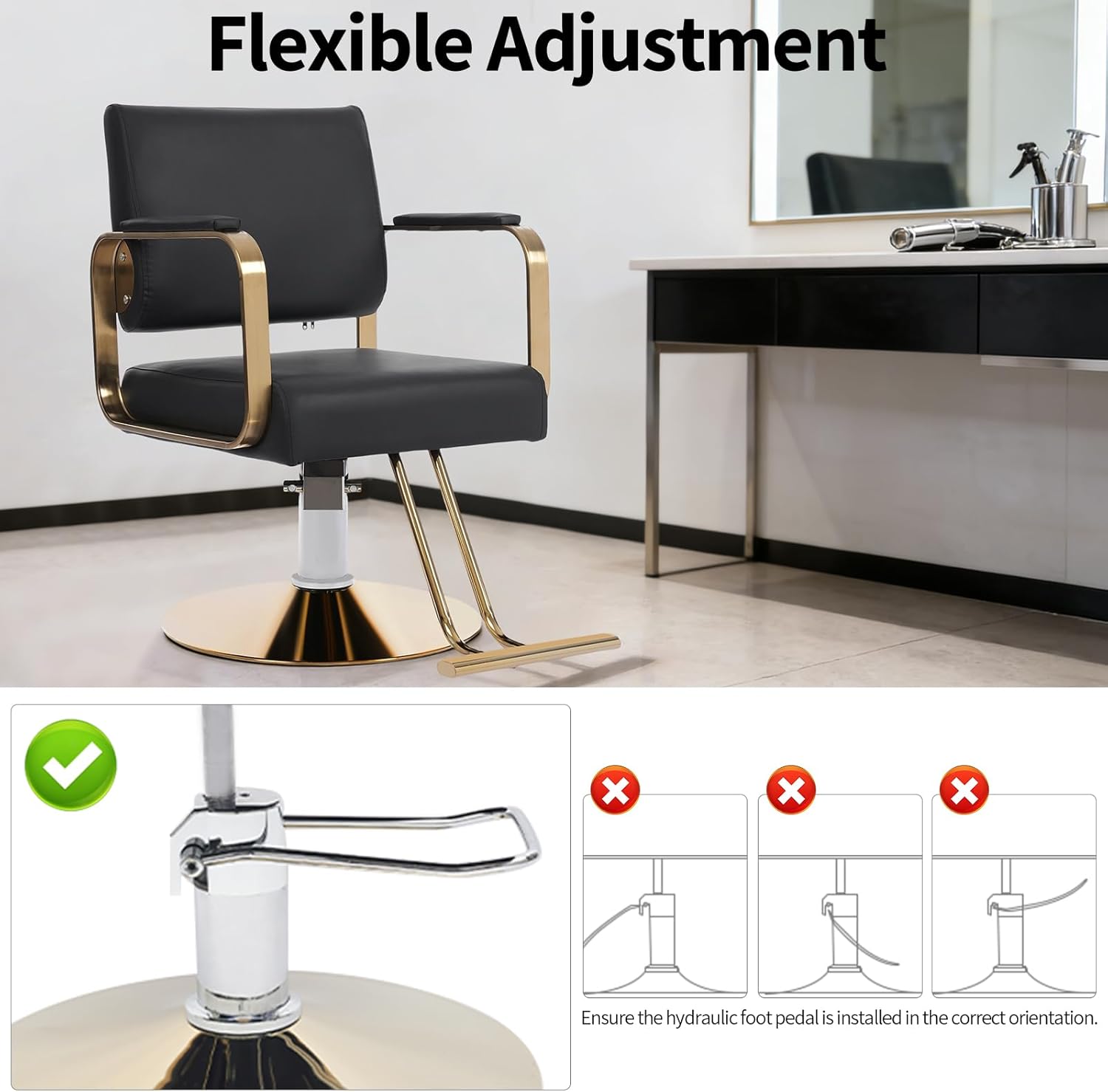 DescriptionOur salon chair combines functionality and aesthetics. High-quality materials and exquisite craftsmanship make it sturdy and durable. The PU cushion with built-in rebound sponge and ergonomic backrest provide you with a comfortable sitting experience. Its adjustable height and 360° rotatable design greatly offer more flexibility. In short, with its outstanding performance, user-friendly design, and generous appearance, it is an ideal choice to enhance the professional image and customer satisfaction of your salons.DetailsRubber Pad: The bottom rubber pad can prevent the product from sliding and also prevent scratching the floor.Sturdy Footrest: It helps release leg pressure and relax the soles of the feet.Comfortable Armrest: It provides stable and comfortable support for your hands.ApplicationIt is suitable for hair salons, beauty salons, homes, barber shops, spas, etc.SpecificationsMaterial: PU, Carbon Steel, Sponge, Rubber Process: ElectroplatingStyle: ModernColor: Black, GoldenAssembly Required: YesMounting Type: FreestandingRotatable Angle: 360°Load-bearing Capacity: 200kg/440.92lbsAdjustable Lift Height: 81-90cm/31.9-35.4inSeat Cushion Size: 57*60*15cm/22.4*23.6*5.9inDistance Between Two Armrests: 50cm/19.7inSeat Height: 47-56cm/18.5-22inPackage Size: 59*58*38cm/23.23*22.83*14.96inGross Weight: 20kg/44.09lbsNet Weight: 19kg/41.89lbsPackage Included1* Salon ChairAll Accessories for AssemblyNotes1. Please double-check the size before ordering.2. Please use this product within the load-bearing range.3. Please allow the slight color difference caused by the shooting light and 1-3cm error due to manual measurement, and make sure you do not mind before you order.