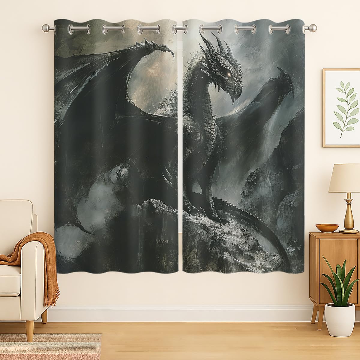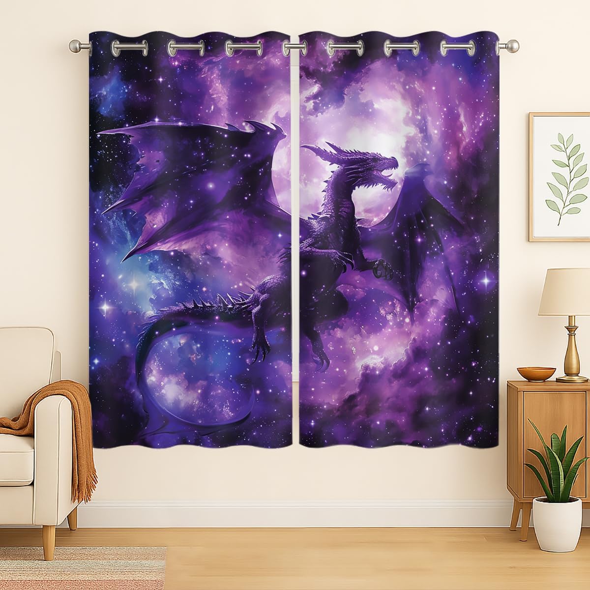 These print curtains are perfect for Living room, bedroom, kids room, kitchen, yard, patio, parlor, sliding door with Purple Dragon, Nebula Mysterious Outer Space pattern.- Unique design:· Save energy costs by insulating against heat and cold.· Reduce noises from busy streets and high-traffic areas.· Protect furniture from sun damage and fading.· Provides complete privacy when needed· Perfect for any bedroom, office kids room and living room.- Package Included:· Blackout window curtains 2 Pcs set ( two panels).- Material:· Our Blackout Curtain Liners are crafted from a durable soft and thick triple weaved blackout fabric which can block out sunlight and UV rays. The darker color of the fabric, the more light it can block.- Easy Care Instructions:· Machine washable in cold water· Do not bleach.· tumble dry on low· low temperature ironing- Notes:· For your curtains to be more perfect, please choose a size 5-10 Inch larger than the actual window width.· here may be slight differences in colors on different displays. If you have any questions about the product, please feel free to contact us.