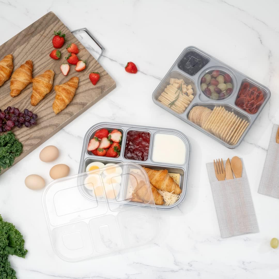 Ensure food stays protected with our Futura 62-ounce Silver Plastic Tamper-Evident 5-Compartment Containers. Featuring a tamper-evident break tab, these to go containers indicate if they have been unsealed to alert customers of possible tampering. The 5 compartments of these takeaway boxes have a capacity of 16.2, 10.8, 7.1, 7.1, and 5.4 ounces to hold several sides or snacks in one container. The included lids of these carry out food containers protect meals from spilling out and making a mess. As a bonus, the lids have a crystal-clear finish for quick identification during busy service hours. These take out food containers are microwavable so customers can easily reheat meals after their orders have arrived. Constructed from PP plastic, these BPA-free take out containers are conveniently recyclable to shorten the cleaning process at your foodservice establishment. These tamper-evident containers measure 11 inches long by 8.5 inches wide by 1.75 inches tall and contain up to 62 ounces. Sold in a 100 count box.