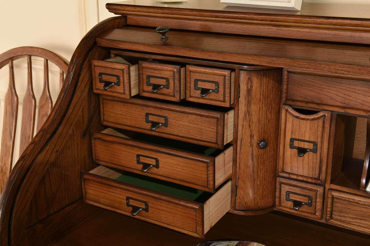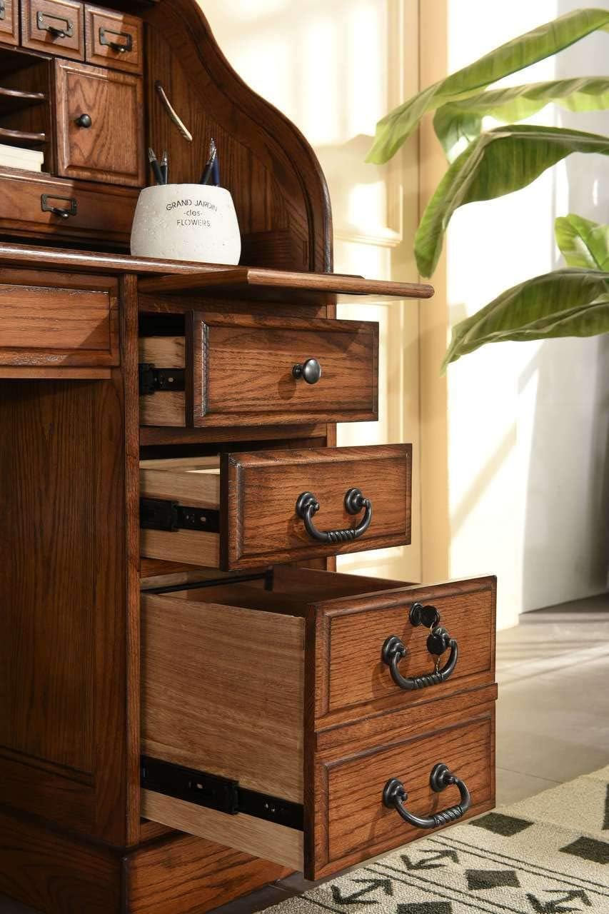 54"W x 28.5"D x 49"H Nostalgic Vintage Styling -turn of the century look with 25 drawers to organize your office space and files. Two deep file drawers with heavy duty metal extension glides Locking file drawers Solid Wood tambour with full canvas underneath and key lock Roll the top down to hide the "work in progress"! Two pull out writing tablets Expands your work space. Generous work area writing surface Solid Oak Pencil Organizer in Felt Lined Center Drawer Solid wood raised panels on sides. Dove-tailed drawers on all base drawers with additional metal runner system for heavy duty use. Electrical plug in unit with USB ports built in to desk surface. Easy to assemble. Lots of cubbies and small drawers for al your storage needs. Top Hutch completely assembled. Base constructed of two drawer pedestals with back panel and center drawer. Knee hole Space 23"Wx26"Dx25" High quality Solid Oak Construction with Antique Burnished Walnut Stain for rich antique style finish. Solid Wood Dovetailed Drawer construction on all seven base drawers