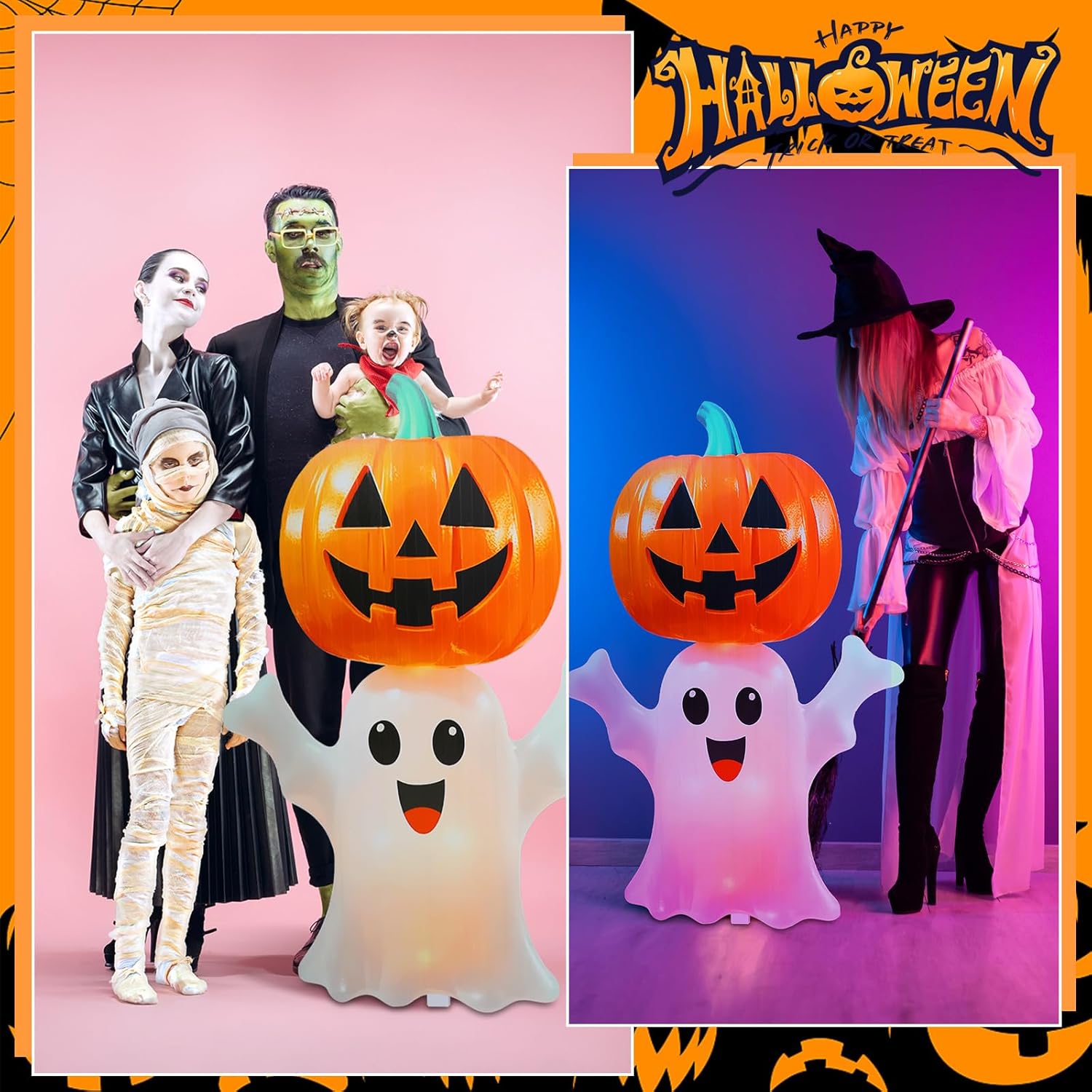 Product Features: Suit value configuration, one-stop solution: Including a full set of accessories such as stand, support rod, backboard, stickers, etc., no additional purchase is required, it can be applied out of the box, saving time and effort to create a horror party! Safe and thoughtful details: No sharp edges, safer contact. Self-adhesive support stakes are stable and anti-falling, and there is no need to worry about the risk of tipping during the party carnival. Specifications: Main Material: PVC Color: colorful Size: 5 Ft tall Package Included: 1 x Halloween Pumpkin Ghost life-size cardboard stand Note: Manual measurement, there may be errors in size. Due to different screen displays, colors may vary slightly Small parts included, please keep them away from little kids to avoid swallowing risk