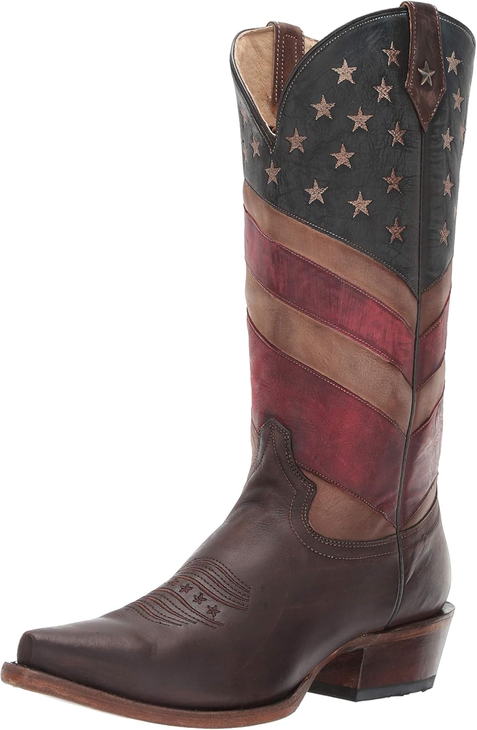 The old Glory boot by Roper is a great choice for style and comfort and comes in square toe or snip toe. This boot has a new americana design with vintage brown leather vamp and shaft. It has a leather sole and a rest removable insole.