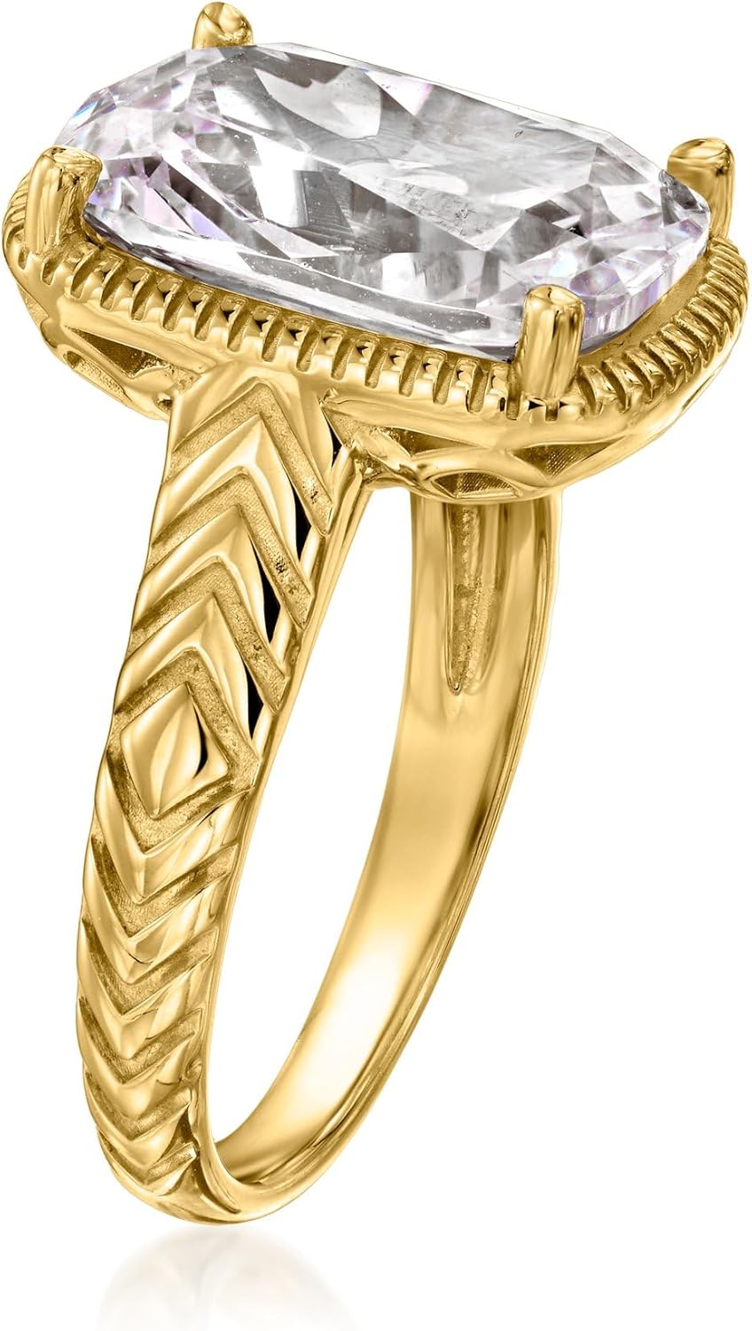 Ross-Simons is always looking for new ways to reinvent essential jewelry styles. It's the details that make this affordable sparkler look more expensive! A dazzling 10.00 carat rectangular cushion-cut CZ is impossible to miss. Neatly set in a stylized border of polished 18kt yellow gold over sterling silver, with a chic chevon pattern along the sides of the band. 5/8" wide. CZ ring. CZ weights are diamond equivalents. Stone InformationGem Type 1: Cubic-ZirconiaStone Cut 1: Good-CutStone Color 1: Good-CutStone Clarity 1: Good-CutStone Shape 1: Rectangular-ShapeStone Creation Method 1: SyntheticStone Treatment Method 1: Not-TreatedStone Weight 1: 10.00 CaratsNumber Of Stones 1: 1