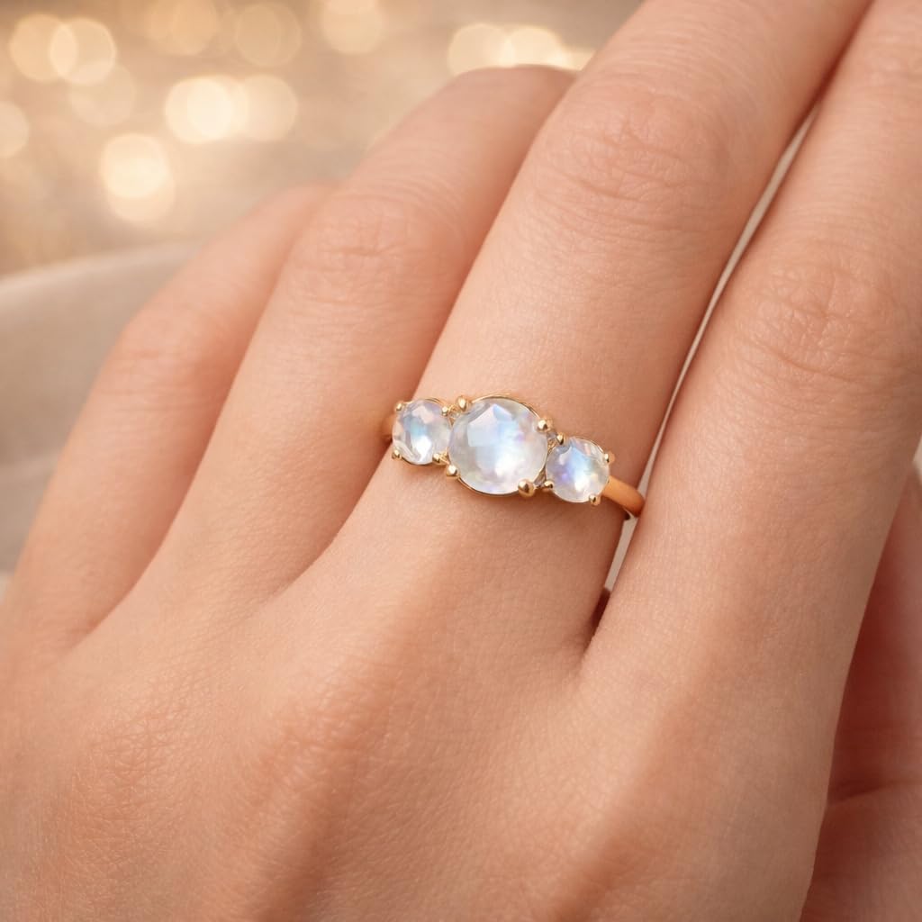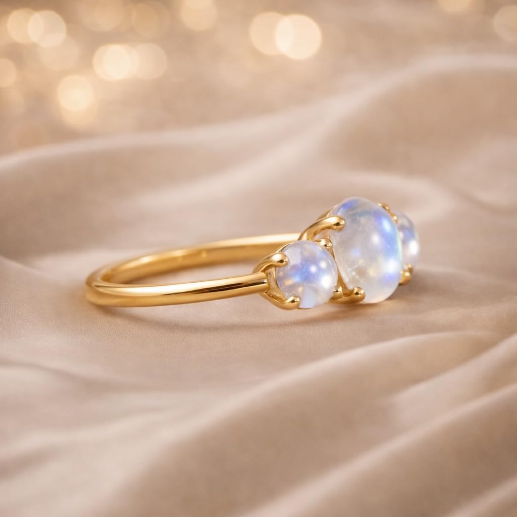 Capture the magic of moonlight with this elegant three-stone moonstone ring crafted in radiant yellow gold. Featuring three luminous rainbow moonstones, this ring glows with soft flashes of blue and iridescent light, creating a dreamy celestial effect. The classic three-stone design symbolizes past, present, and future, making it a deeply meaningful choice for engagements, anniversaries, or promise rings. Each round moonstone is securely set to highlight its natural adularescence, offering a subtle yet captivating shimmer with every movement. Its minimalist gold band ensures comfortable daily wear while maintaining a timeless and sophisticated look. Whether worn alone as a delicate statement piece or stacked with other rings, this moonstone ring adds effortless elegance to any jewelry collection. A romantic and symbolic fine jewelry piece perfect for celebrating life’s special moments.