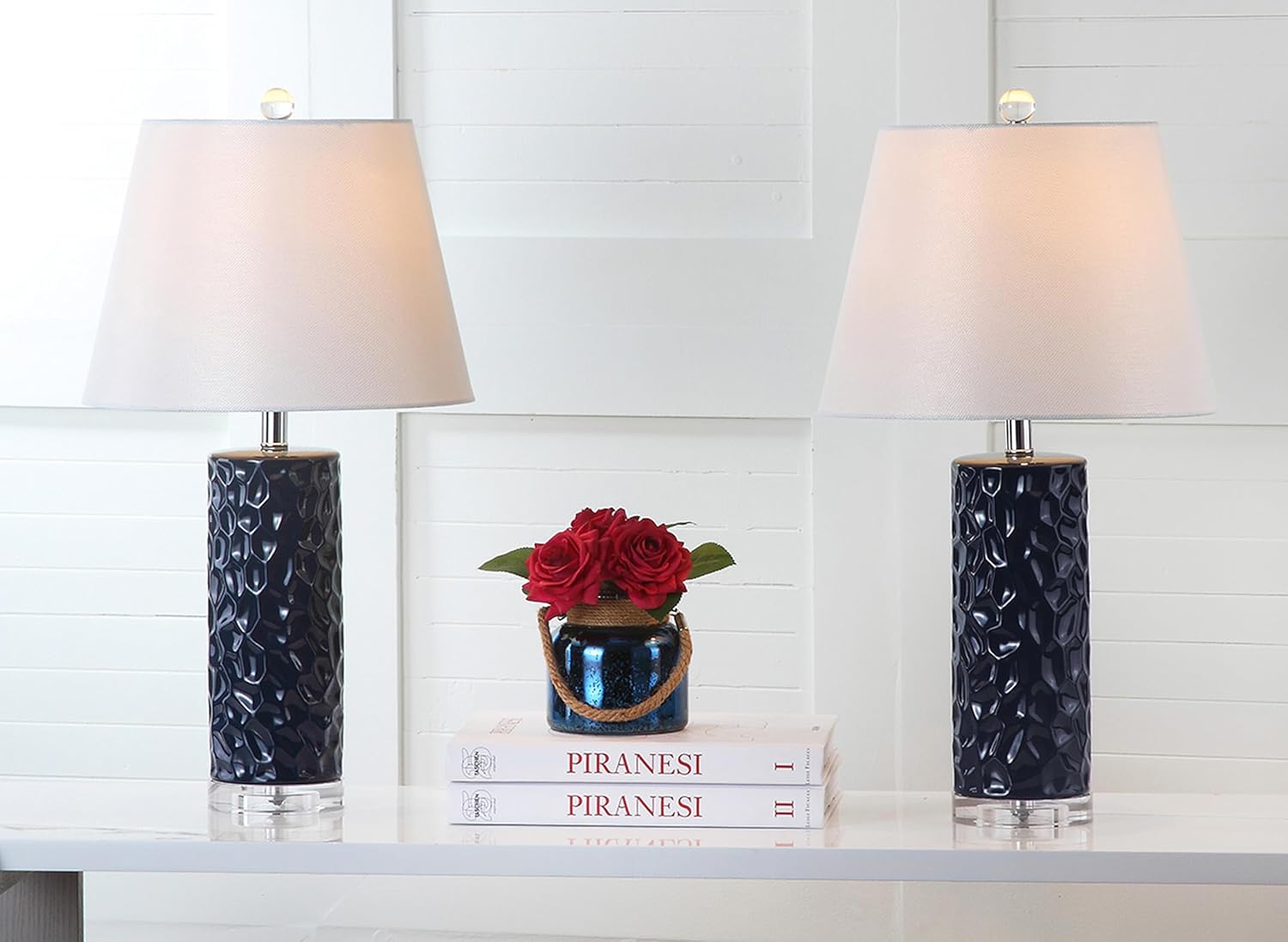 Inspired by the texture of a pair of antique lamps, this set of two glazed navy blue ceramic Dixon table lamps is ideal for transitional interiors. An inverted thumbprint motif is contrasted with a textured white cotton drum shade and a see-through base.