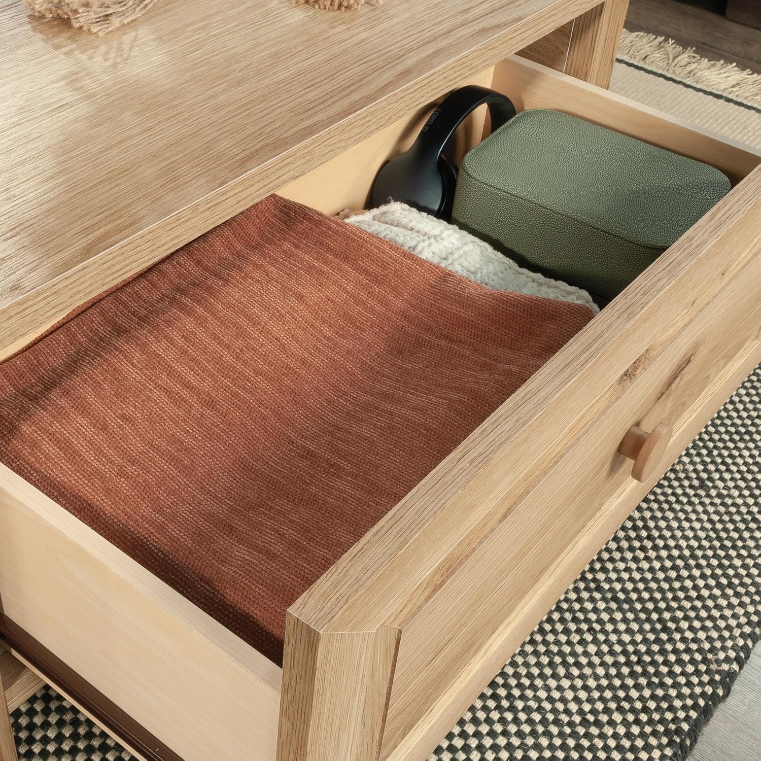 Come on in and sit a spell, with the farmhouse lift-top coffee table from the Hillmont Farm® collection. This pop-up coffee table offers a durable, 1-inch-thick surface – a perfect place to rest your steaming mug of coffee. As your coffee cools, plunk your laptop on the partial lift-top surface that raises up and forward to create versatile work surface from the comfort of your sofa. This coffee table with lift-top also features useful storage, both beneath the split top surface, and a drawer that easily slides open on metal runners with safety stops. Finished on all sides in cozy and warm Timber Oak®, this lift-top coffee table with storage offers versatile placement in any living room or family room setting for a handsome and handy touch of country charm. With simplistic elegance of natural woodgrain, this lift-top coffee table with drawer will be easy to incorporate into any home décor.