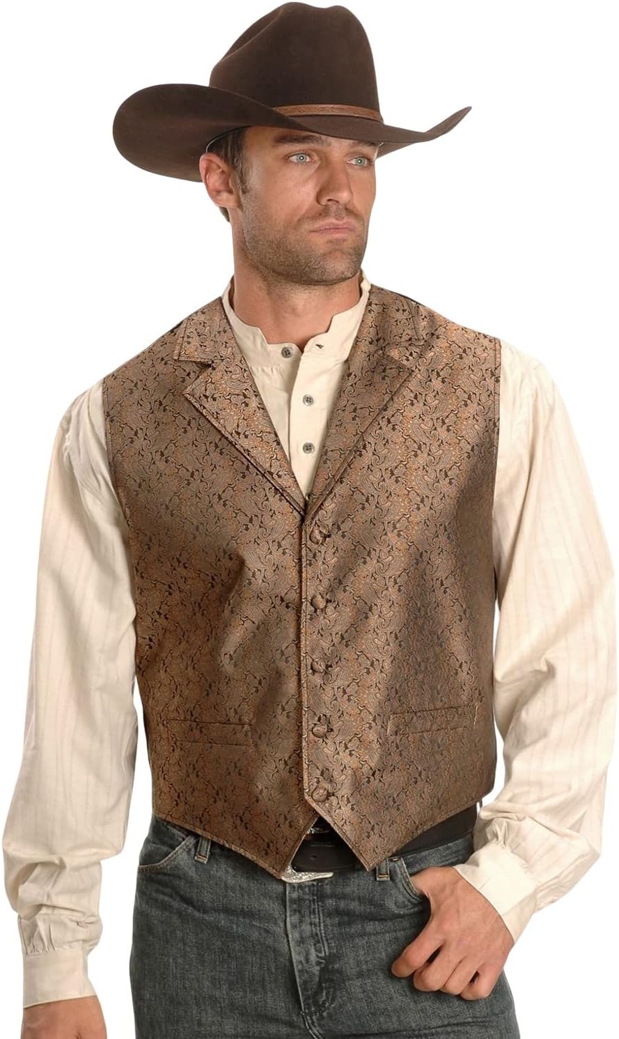Rangewear by Scully makes high-quality western wear for modern cowboys This Scully vest features a button front placketfortable spread collar. Two faux welt pockets at front. Fully lined. Vest is made of 100% polyester. Imported. Sizes: S(38), M(40), L(42-44), XL(46-48), 2XL(50).