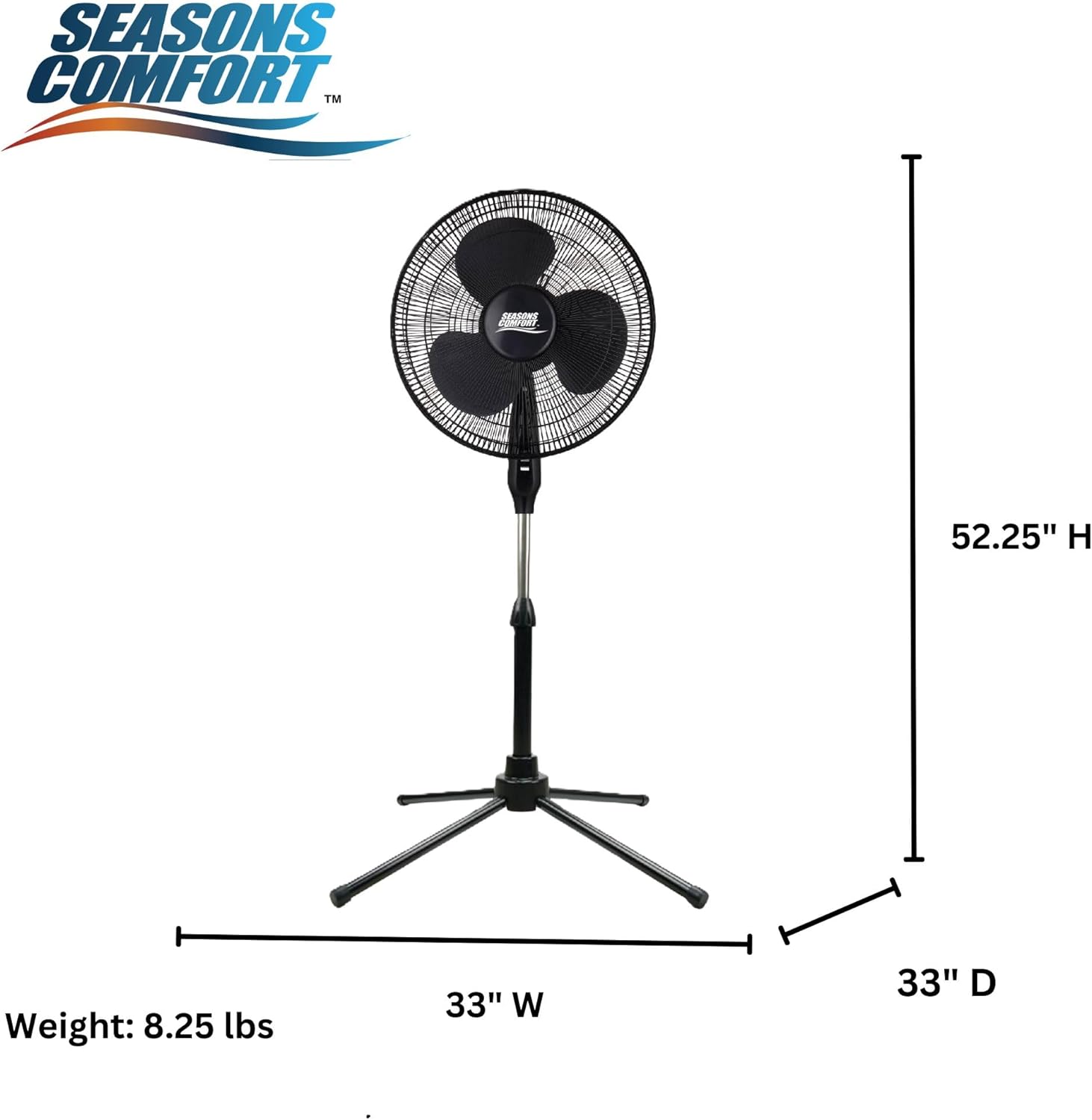 Seasons Comfort 18 Inch Pedestal Oscillating Fan, 3 Speeds, Adjustable Height, Push Buttons, Quiet - Electric Cooling Fan for Home, Office & Bedroom Use Stay cool and comfortable with the Seasons Comfort 18-Inch Oscillating Fan, a versatile and powerful cooling solution designed for large spaces. This fan features an adjustable pedestal base that allows for customizable height, ensuring optimal airflow whether you're cooling your bedroom, office, or living room. The oscillating fan head provides wide-area coverage, making it perfect for larger rooms and spaces. With three-speed settings, you can easily select the perfect level of airflow, from a gentle breeze to a powerful cooling gust. Quiet operation ensures that the fan operates smoothly without disturbing your environment, making it ideal for use in bedrooms or workspaces where noise is a concern. The manual adjustable tilt control enables you to direct airflow where it’s needed most, while the sturdy folding base offers stability during operation and folds for easy storage when not in use. The 60W motor provides efficient and powerful airflow to keep your space cool on even the hottest days. This fan is ETL Listed, ensuring it meets high safety standards, and comes with a durable 5-foot power cord for flexibility in placement around the room. Whether you need a standing fan, pedestal fan, or oscillating fan for your home or office, this fan combines practicality, performance, and style in a convenient, portable design. Approx. size 52.25"H x 33"W x 33"L.