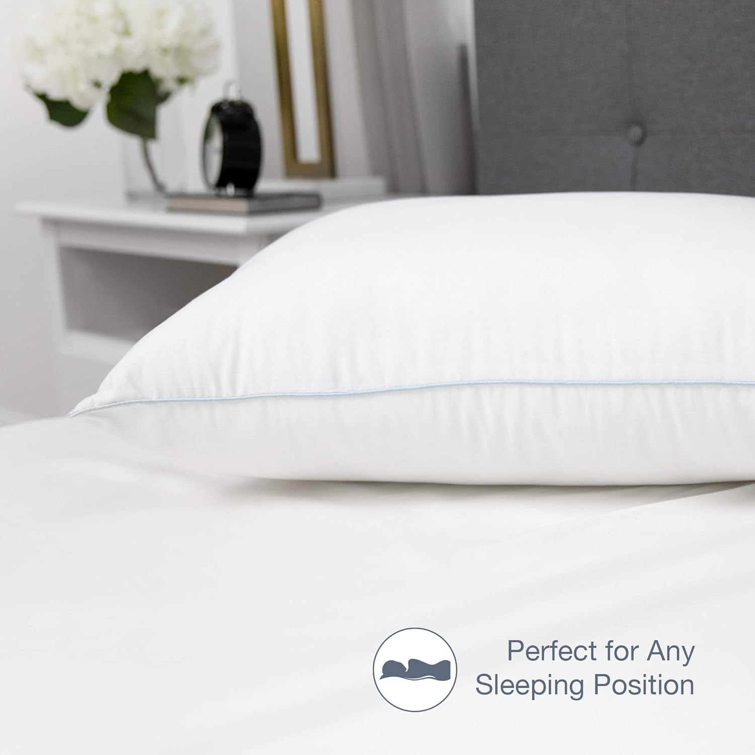 Relax and enjoy the plush comfort of fiber regardless of your sleep position when resting on the Any Position Bed Pillow from SensorPEDIC. Each pillow is filled with lofty hypoallergenic fiber and is an ideal choice for all sleep positions and sleep styles. The ultra-soft 250 thread count, 100% cotton sateen cover adds a layer of smooth softness and features a light blue decorative trim to add luxury to any room..