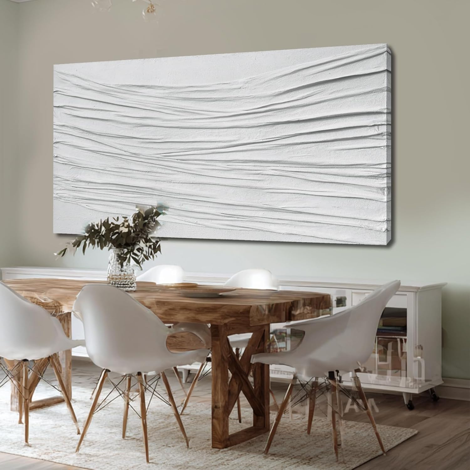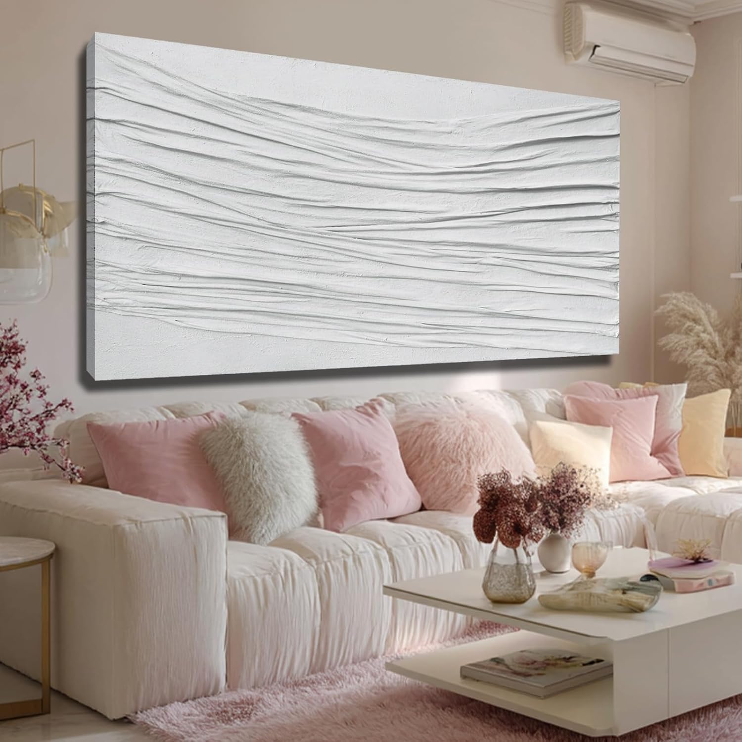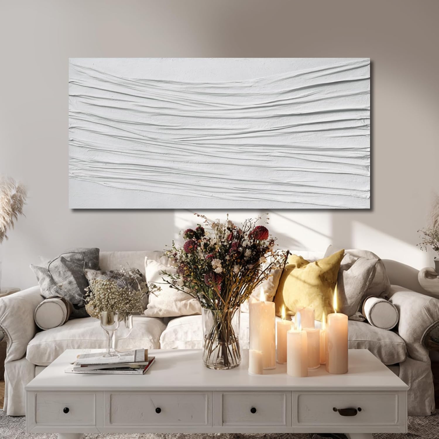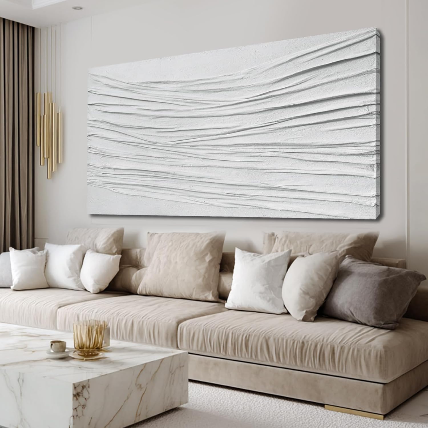 Bring depth and modern elegance to your space with this hand-painted white textured canvas wall art, designed with a flowing 3D line structure that adds movement and dimension to any room. Each piece is individually crafted by artists, ensuring a unique finish that printed artworks cannot replicate. Painted on premium canvas and stretched over a strong wood frame, this large abstract wall art blends seamlessly with Scandinavian, minimalist, and neutral home styles. Its all-white palette enhances light and creates a calm, polished atmosphere—ideal for living rooms, bedrooms, hallways, or offices. This gallery-style piece arrives ready to hang, offering instant sophistication for your home. Whether you're refreshing your décor or gifting a meaningful present, this elevated piece of modern wall decor provides timeless texture and handcrafted beauty. Enhance your environment with the purity and artistry of hand-painted textured wall art.