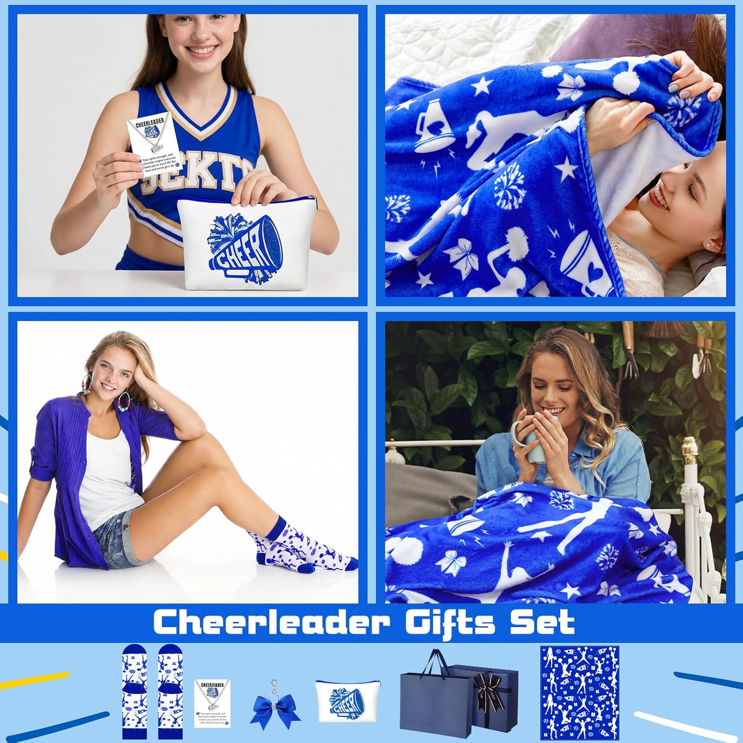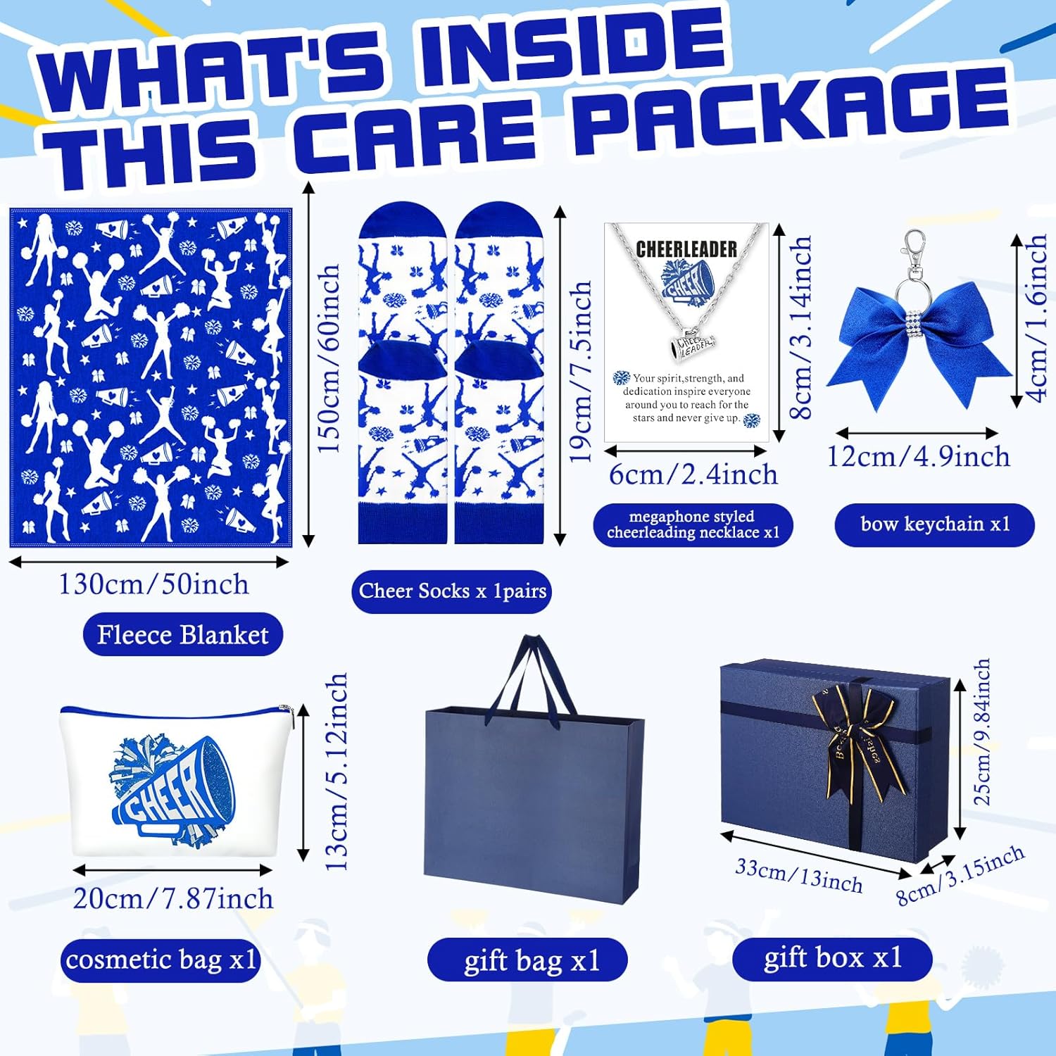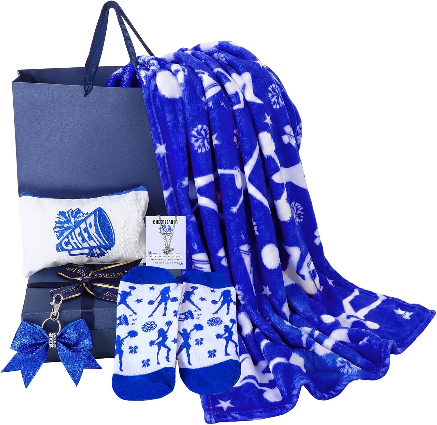 Features: Our cheerleader gift box is a distinctive and novelty gift for the important woman in your life, suitable for Valentine's Day, Christmas, birthdays, Thanksgiving, Mother's Day or other important holidays In addition to your own daily use, you can also send our cheerleading accessories set as a gift to your family, friends, teammates, sisters or girlfriends. Using it on special days or in daily life can bring good memories to each other. When she receives this nice cheerleading gift, she will be very happy and surprised. Specifications: Material: Flannel blanket: flannel Makeup bag: fabric Bow keychain: cloth, sturdy metal, and rhinestones Necklace: alloy Sock: cotton Color: blue Size: Flannel blanket: 40x50 inches /100x130cm Makeup bag: 9.06x5.91x1.57 inches Bow keychain: 4x12cm/1.6 x 4.8 inch Necklace: 45cm/17.72 inch Sock: 7.5x7.5 inches/19x19cm Gift box: 30 x 20 x10 cm/11.81 x 7.87 x 3.94 inch Package includes: 1 x Flannel blanket 1 x Makeup bag 1 x Bow keychain 1 x Necklace 1 x Sock 1 x Gift box 1 x Gift bag Notes: Manual measurement, please allow slight errors on size. The color may exist a slight difference due to different screen displays