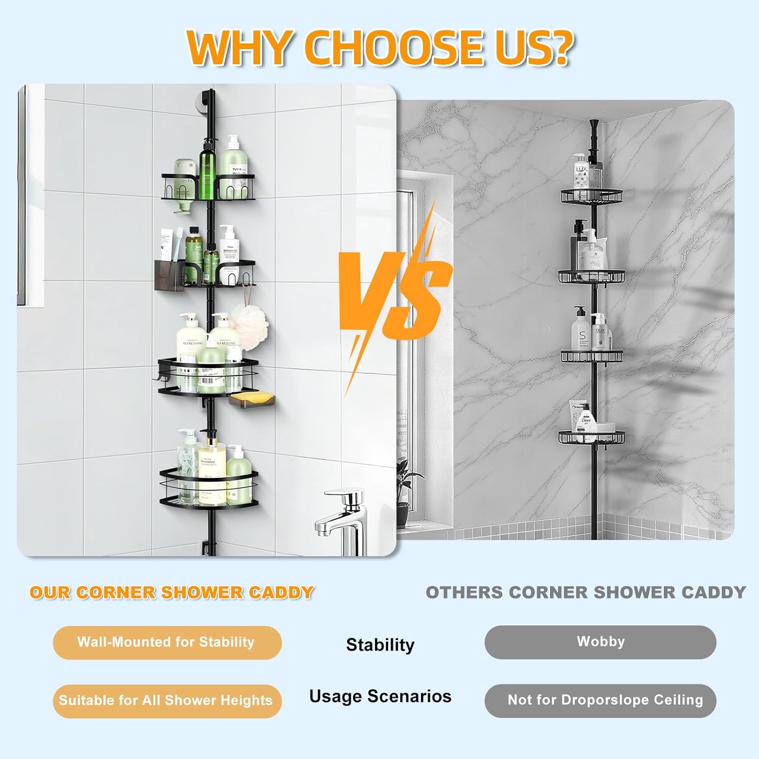 | Included Components | 1 × Instruction Manual 2 × Small Basket 2 × Large Basket 1 × Pole (5-Piece) 4 × Fixing Clips 2 × Corner Brackets 4 × Corner Bracket Adhesive Pads (Square) 2 × Corner Bracket Adhesive Pads (Round) 1 × Soap Dish 1 × Razor Holder 1 × Toothbrush Holder 2 × Brass Nuts 1 × Hex Wrench 1 × Fixing Screws |