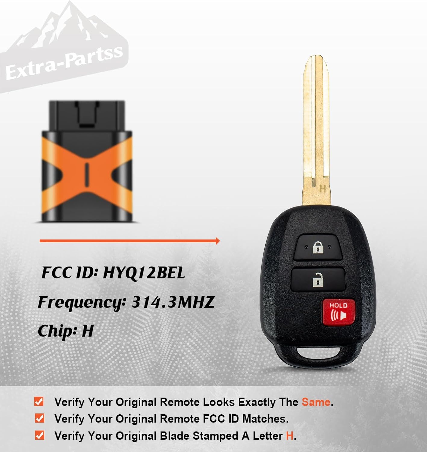 Replacement for FCC ID HYQ12BELFrequency: 315MhzChip: HPlease Note: Your Original Remote Must Be With FCC ID HYQ12BEL and Looks Identical.Please Note: Your Original Key Blade Must Stamped With Letter 'H'. Please Note: Your Vin Must Start With 1,2,4 or 5. Compatible Vehicles:2016-2019 for Toyota Tacoma