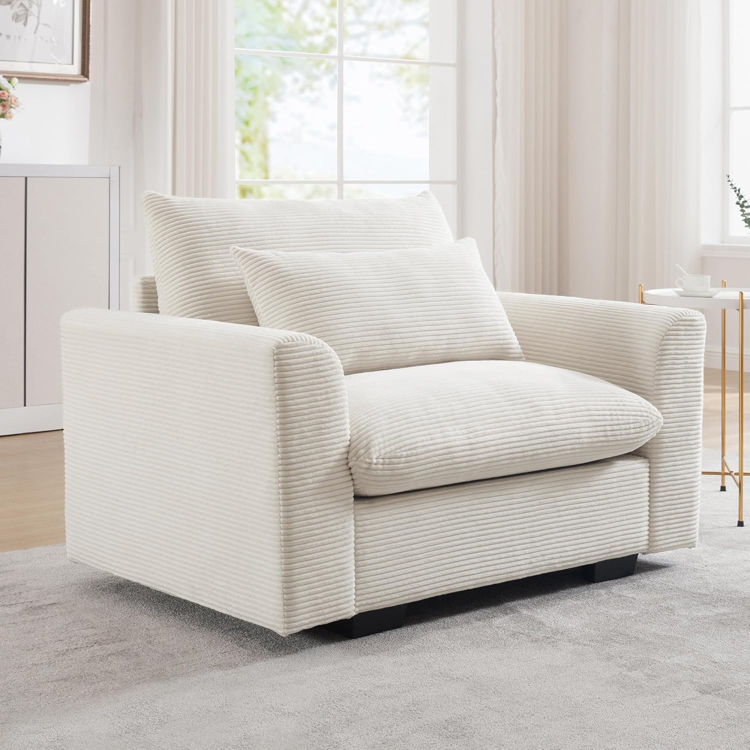 Introducing our Extra Deep Seat Sofa Chair – the epitome of comfort and luxury. With its generous dimensions of 51" W x 33.8" D x 34.6" H, featuring a seat depth of 25.2” and a seat height of 18", this oversized chair surpasses conventional accent chairs in every way. Its enlarged, widened, and deepened seating area promises an unparalleled lounging experience, fostering a heightened sense of security and indulgence. Ultimate Comfort Experience ultimate relaxation with our sofa chair. A soft lumbar pillow offers precise support, aligning with your body's natural curves to banish daily fatigue. The ergonomic seat angle ensures a sense of security and unparalleled comfort, while the cushions filled with high-quality rebound sponge guarantee maximum support and softness. Sink into the cozy embrace of our living room chair and indulge in pure bliss. Premium Craftsmanship Crafted with meticulous attention to detail, this corduroy couch chair boasts a robust solid wood frame and luxurious corduroy fabric. Its distinctive tactile appeal and cozy ambiance create the perfect spot to unwind and indulge in relaxation. Capable of supporting up to 250 lbs., this armchair is a testament to its durability and strength. Multifunctional Usage Versatile and stylish, our armchair accent chair is ideal for creating a cozy reading nook or a personal relaxation spot. Curl up with your favorite book or simply unwind in luxurious comfort – the choice is yours. Perfect for living rooms, bedrooms, and apartments, this cozy chair adds a touch of elegance and functionality to any space. Effortless Assembly Bringing your new sofa chair to life is easy and hassle-free. All necessary tools are included, and assembly instructions are straightforward. Simply wipe down regularly with a soft, dry cloth to maintain its pristine condition and prevent dust build-up. Please note that packages may arrive separately within a few days, so your patience is appreciated. Indulge in the ultimate lounging experience with our Extra Deep Seat Sofa Chair – the perfect addition to your home.