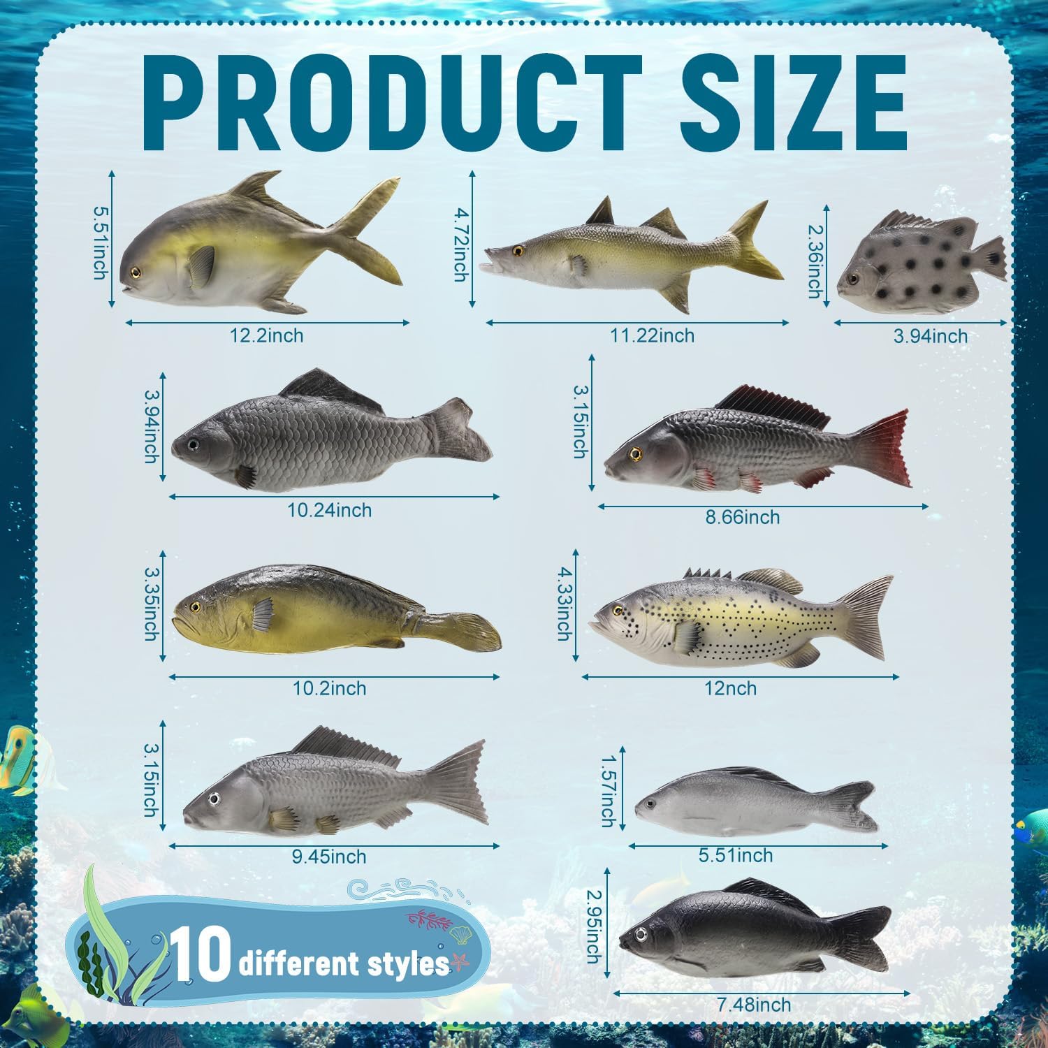 Features: The simulated fake fish colors clearly reflect the actual colors you usually see in real fish, and every detail from the eyeballs to the scales is lifelike like a real fish, so you can use them in your home, office or event to provide an aquatic feeling. Our artificial fishes are designed with high simulation, which can attract even the most discerning eyes. We carefully constructed every detail from the eyeballs to the scales to reflect the real fish. Specifications: Material: PU Color: multicolor Size: Large simulated sea fish: about 12.2 x 5.51 inches/ 30.99 x 14 cm Small simulated sea fish: about 3.94 x 2.36 x 0.8 inches/10 x 6 x 2 cm Package includes: 10 x Fake Fish Notes: Manual measurement, please allow slight errors on size. The color may exist a slight difference due to different screen displays.