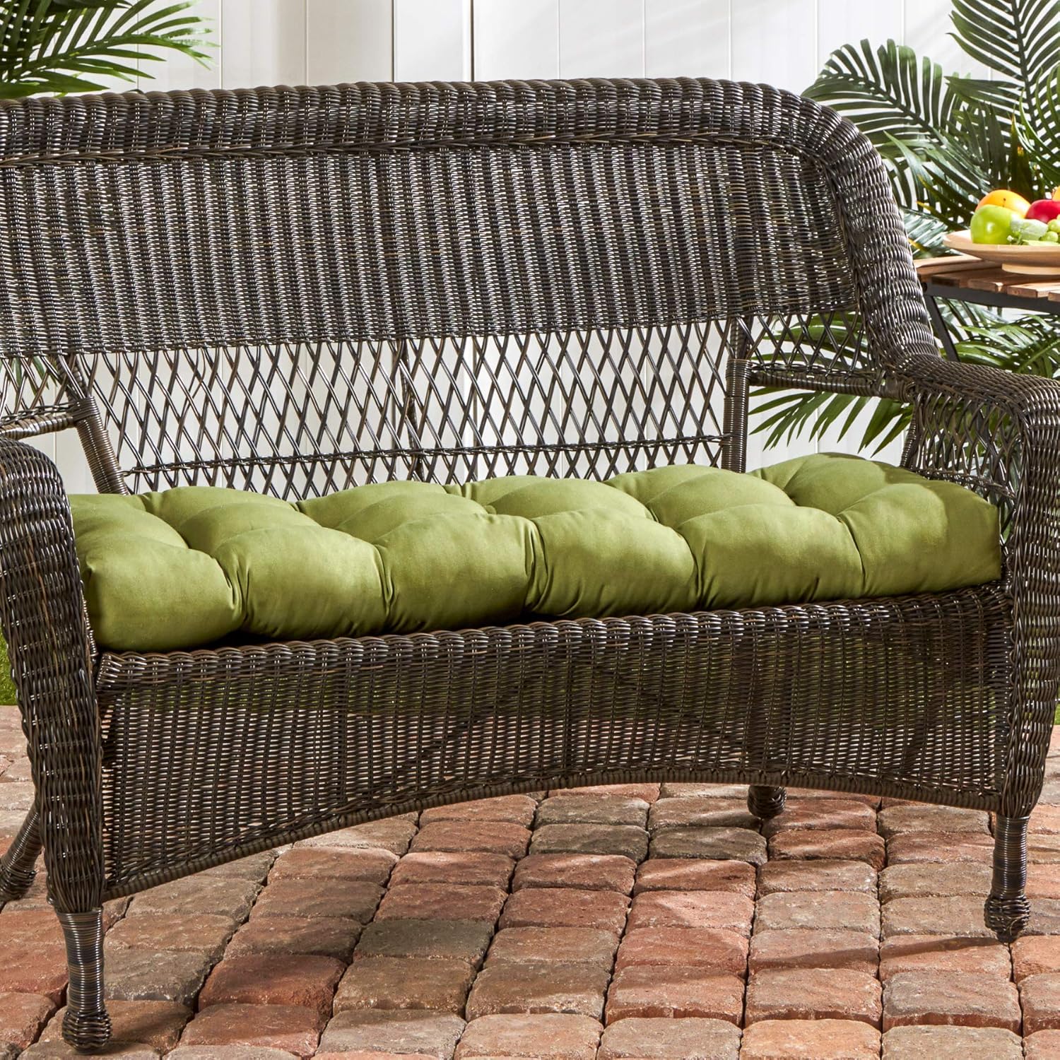 Give your outdoor swing or bench an appealing update with this plush outdoor cushion from South Pine Porch. Covered with a UV resistant, 100% polyester outdoor fabric, this cushion is resistant to water, stains, and fading making it an ideal low maintenance choice for your outdoor furniture. Attached string ties keep this cushion firmly in place, while its circle tufted construction helps to prevent fill from shifting. Each cushion is overstuffed for added comfort and durability with 100% recycled, post-consumer plastic bottles. A variety of colors and prints are available to complement your outdoor decor.All South Porch Pine cushions and pillows are individually filled and sewn closed in the USA.Cushion dimensions are +/- 2 inches. Please note product will arrive in a slightly compressed state; please allow a few days for product to expand to final size listed in description.