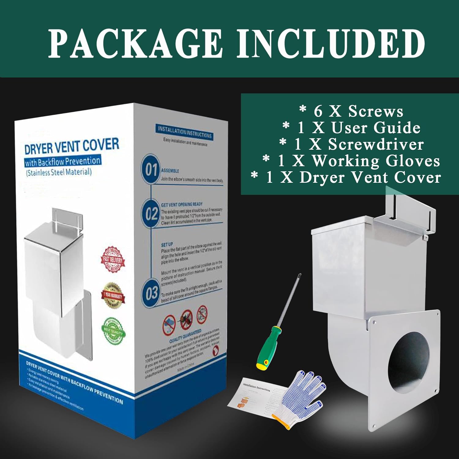 | Included Components | 1 X Dryer Vent Closure, 1 X Screwdriver, 1 X User Guide, 1 X Working Gloves, 6 X Screws |