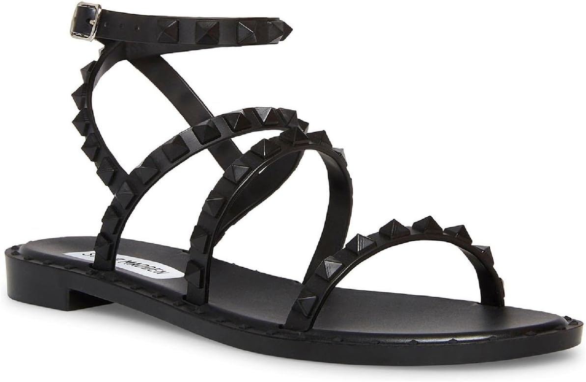 Crossing delicate skinny straps with edgy metal pyramid stud embellishment, the TRAVEL sandal is at once fierce and feminine. Style with a draped maxi dress for a goddess-worthy look