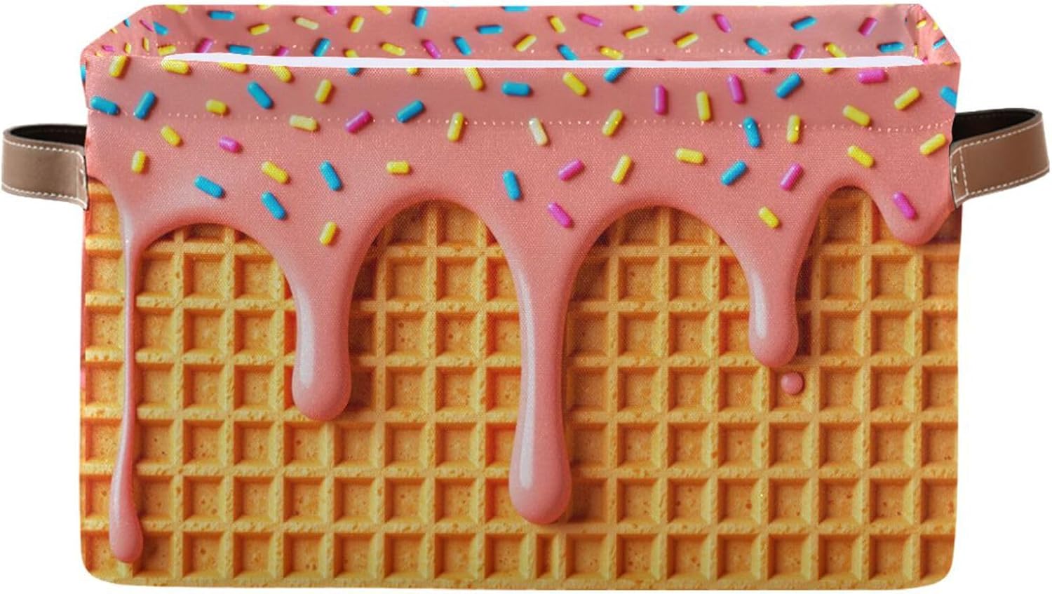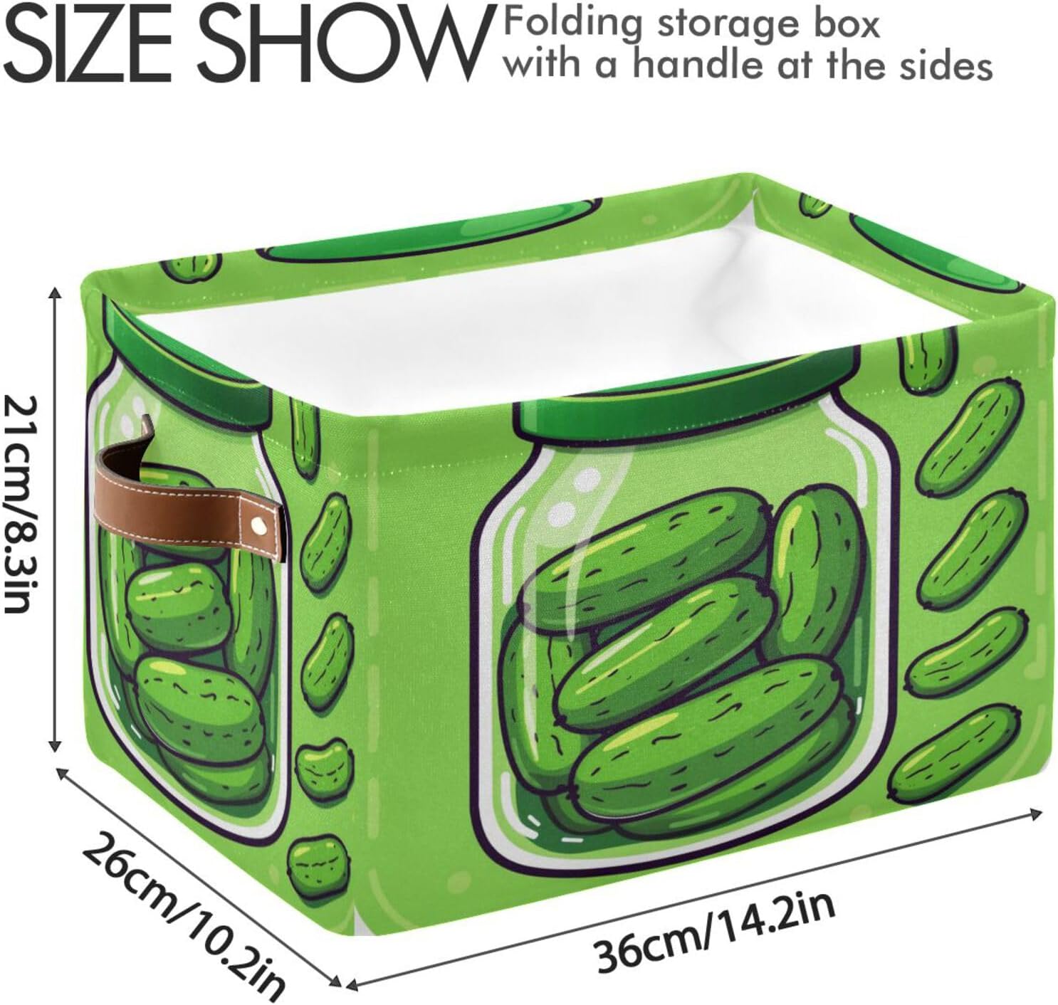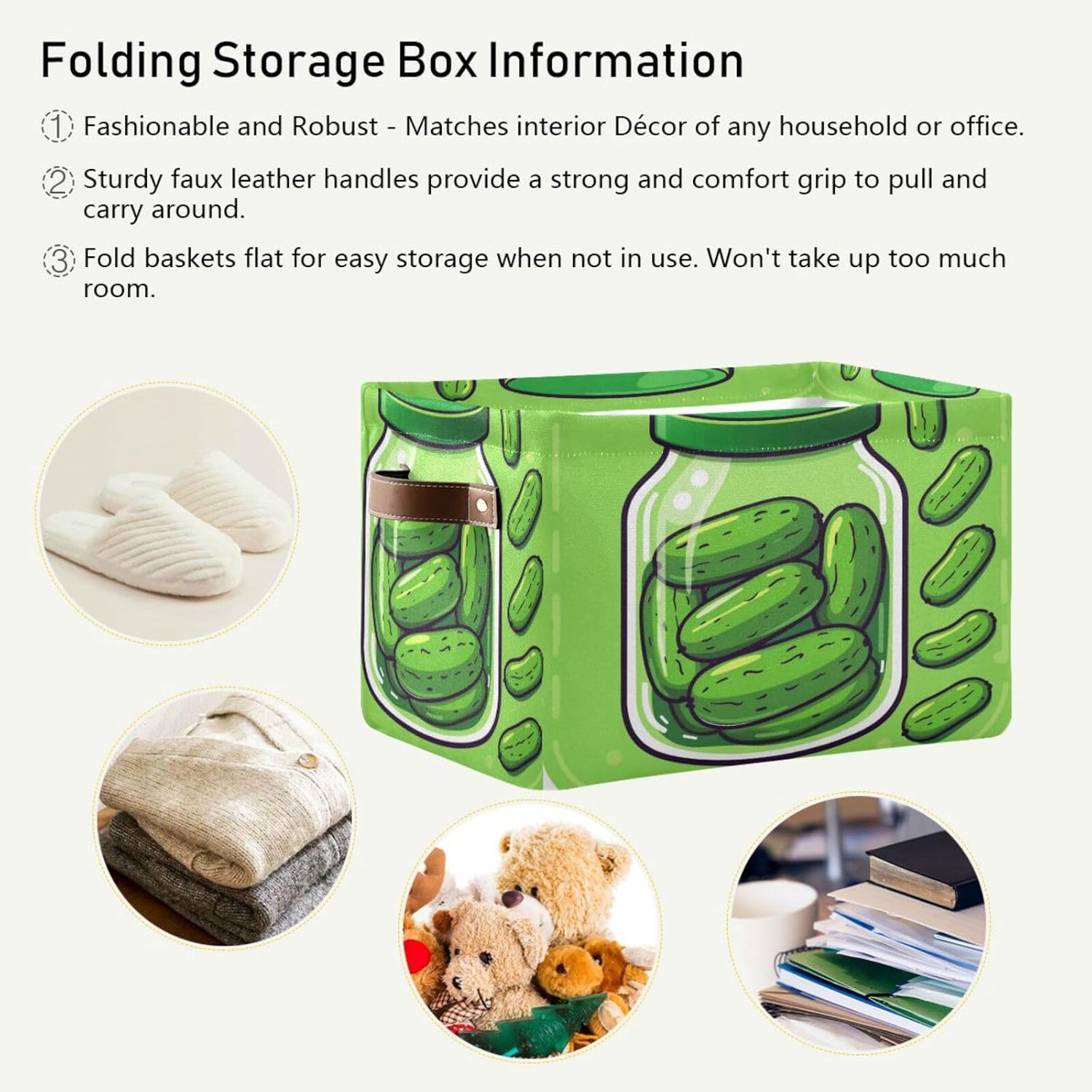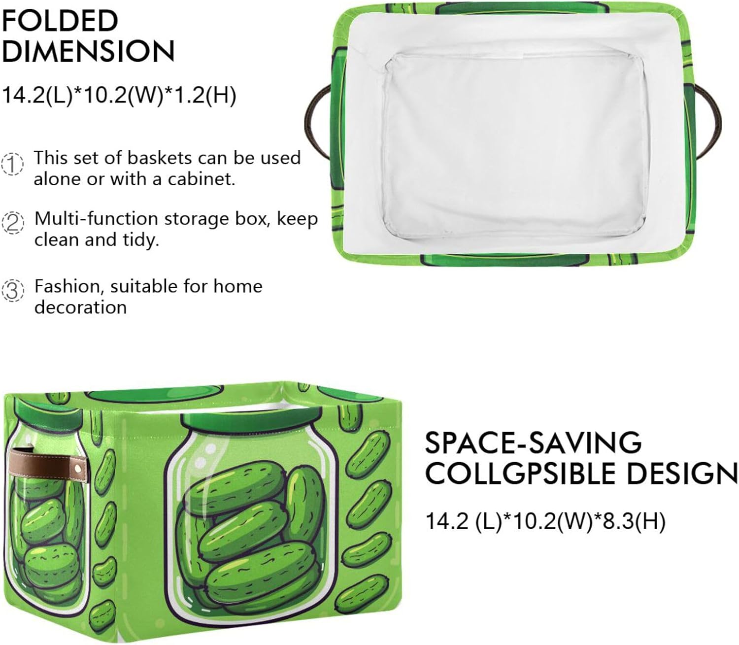 Our shelf baskets are printed on the outside and bottom and fixed in white on the inside. Large capacity. Toy baskets can be compressed and stored when not in use, or it can be used as a separate storage basket and put it wherever you need it. Foldable, easy to store; made of high-quality materials, can be reused many times. A variety of patterns can increase the family atmosphere, and the storage basket is also an indispensable holiday decoration for daily, Christmas, Thanksgiving, New Year, and parties.Printing: Printed on the periphery and bottom, fixed white insideSize :L x W x H---15 x 11 x 9.5 in / 38 (L) x 28 (W) x 24(H) cmMaterial:Canvas Exterior, White coated PE fabric Interior LiningCapacity: 25.6 LitersApplicable scenarios: 1. Wardrobe: underwear, socks, clothes, etc.2. Living room: books, crafts, DVDs, etc.3. Playroom: Store toys.4. Office: Store office supplies and documents.5. Laundry: Cleaning supplies, detergents, cloths.6. General storage: dry goods in the pantry, sheets and towels, storage baskets for groceries in the car.Tips:1. The color may be slightly different from the picture above due to different lighting and monitor settings.2. The product will crease during transportation, just need to be filled with something to support it.3. Machine washing is not allowed, hand washing is recommended.