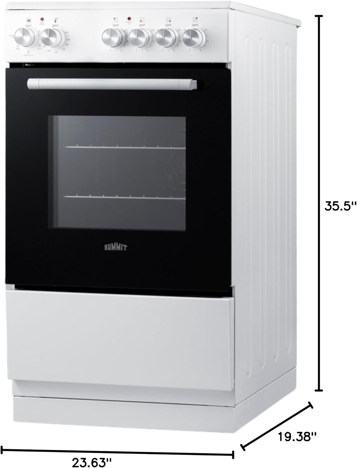 European Design Electrical Range: Summit's European-designed ranges offer cooking convenience for compact spaces. The REXT24BL, a 220V electric range, is just under 24" wide, perfect for versatile kitchen layouts. It features a smooth glass cooking surface with two 6" burners and two 8" burners for diverse cooking needs.