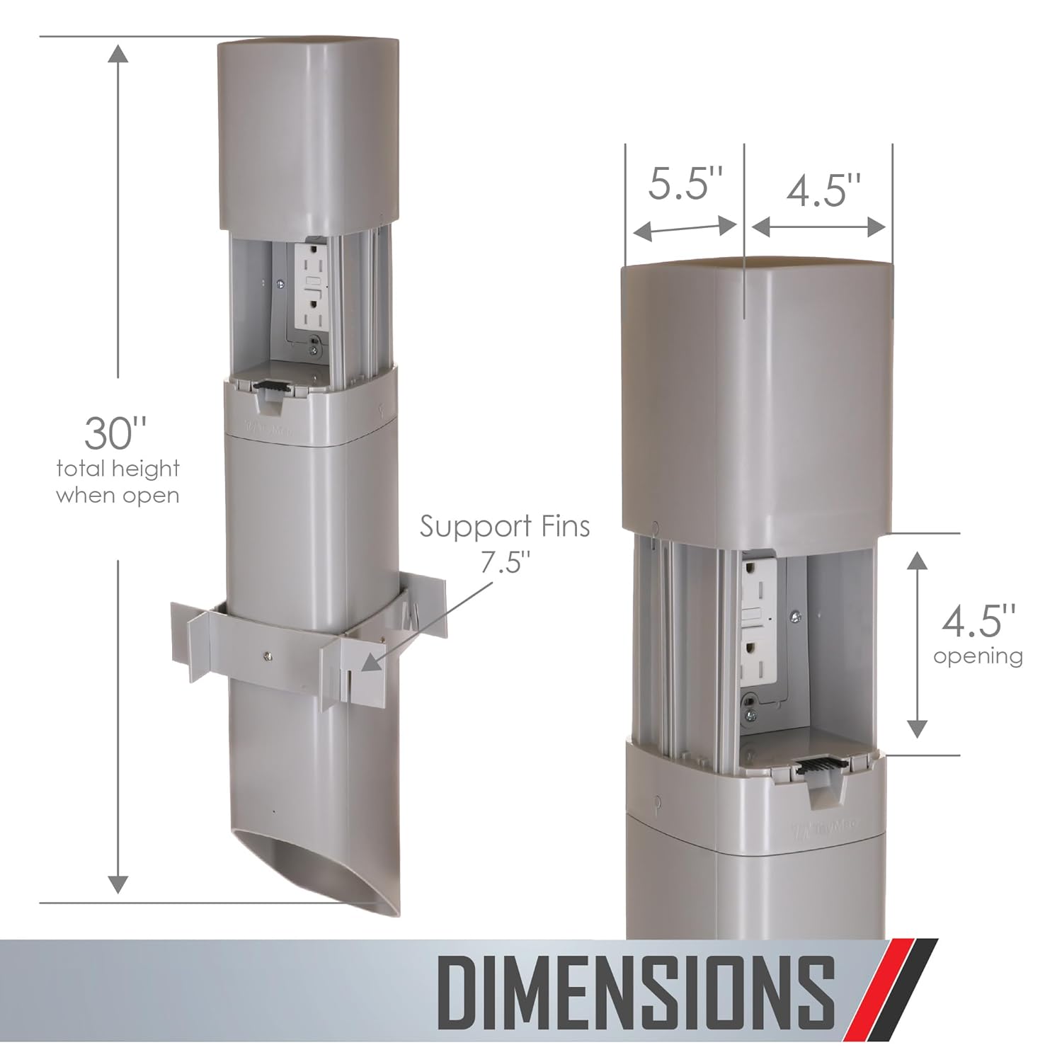 VERSATILE WEATHERPROOF OUTDOOR OUTLET BOX Provide electrical power “behind the fence” near patios, spas, outdoor kitchens, shade structures, or fire pits at single-family residences. Make rental properties more attractive with unique features using our TayMac 1-Gang Weatherproof In-use Power Post. This versatile outdoor equipment makes for excellent garden decor while hinting at flexible outdoor electrical activity. Unlike most other outdoor power stakes, you can install our PowerPost right out in the open. Our sleek and stylish outdoor power outlet is great for prominent locations. It's a flexible outdoor outlet that you can set up easily for garden parties, outdoor weddings, and other special events. It's also a tough outdoor power strip that you can leave in the ground as a continuously weatherproof, in-use outlet box. Our outdoor electrical outlet is housed in heavy-duty, UV-resistant polycarbonate for maximum toughness. It's finished in your choice of white, gray, or bronze to blend in with outdoor decor. The innovative slide cover is powered by unique electrical contacts that require no extra wiring. This cover can also be upgraded to mount an LED area light, pagoda light, directional spotlight, or a WiFi speaker. Overall, you get an outdoor outlet box with weatherproof, tamper-resistant GFCI for added safety, or you can fit it with your choice of duplex receptacle, round receptacle, or switch. It can accommodate 2 power cords and is compatible with most 16-gauge grounded extension cords. Provide a sturdy base for your weatherproof outdoor outlets and other external box fixtures without compromising their resistance to the elements. Get our TayMac 1-Gang Weatherproof In-use Power Post today to draw on more and better options for weather-resistant outdoor fixtures for your home improvement efforts. Accessory covers are available--area slide cover, pagoda slide cover, spotlight slide cover, and Bluetooth speaker cover.