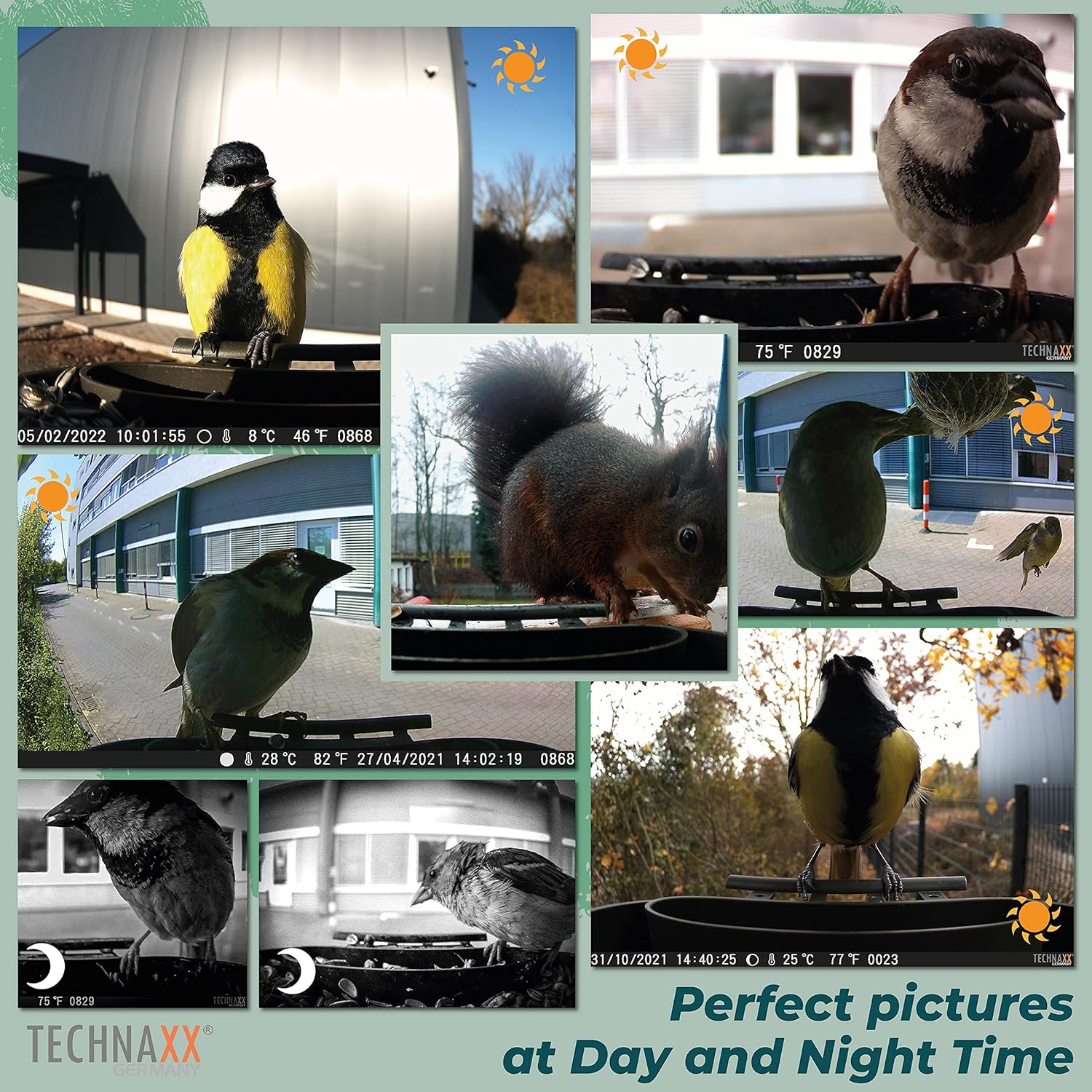 Technaxx introduce you high quality bird watching camera TX-165. This Versatile bird feeder station has so-called bird table for birds dinner and bird bath as a bird water feeder. Read information below to be sure that we do not have competitors on the market. Technical specifications Image sensor: 1/3.2" CMOS 8MP Lens focus: Fixed 0.06-0.15m Lens: f=2.0mm, F/NO2.0, FOV=100°, Auto IR filter; (scratchproof and shockproof) Video resolution: [1920x1080] / [1280x720] / [1280x720 60FPS] / [848x480] / [720x480] / [720x480 100FPS] / [640x480] / [320x240] Photo resolution: 20MP (5200x3900 interpolated), 16MP (4608x3456 interpolated), 12MP (4000x3000 interpolated), 8MP (3264x2448), 5MP (2592x1944), 3MP (2048x1536), 1MP (1280x960) File format JPEG / AV Infrared: 4x IR LEDs (940nm), 0.03-0.5m range Power supply:4x AA batteries* (*included); external DC6V/1A** [**not included] Device language: EN, DE, SP, FR, IT, NL, FI, SE, DK, PO Working temperature: –10°C up to +50°C Weight / Dimensions: 141g (without batteries)/(L) 8.7 x (W) 4.4 x (H) 10.7cm Weight / Dimensions House with seed box and basin: 475g / (L) 19 x (W) 15.2 x (H) 22.8cm Package Contents Material: ABS plastic Technaxx FULL HD Birdcam TX-165, Micro USB cable, mounting belt, wall mount, railing mount, 3x screws & 3x dowels, 4x AA batteries, User Manua