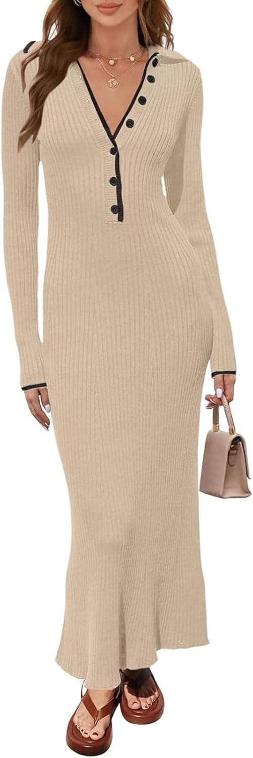 • Unique Design: Long sleeve, polo v neck, foldover collar, button down front, contrast color at cuff and collar, slim fit, bodycon, maxi length, ribbed knit, elasticity fabric, a trendy classic sweater dress for women.