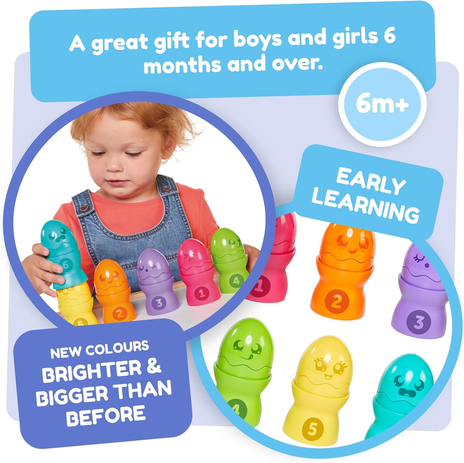 Bigger and bolder that ever before, Hide & Squeak® Egg Stackers have grown in size with eggs that have gone from medium to large! They squeak, rattle, fit together, stack, and tumble down! Little ones will love all the things they can do with this happy half-dozen Hide & Squeak® Egg Stackers. There’s much more to these Egg Stackers than the sum of their parts. From six months on, babies will love to engage with these funny-faced eggs. They’ll discover the brightly coloured chicks hiding inside the shells, with three that go cheep-cheep when they push down, and three that now rattle when they’re shaken. Small enough for little hands to handle, they’ll enjoy reassembling the shells, exploring the contrasting, curious faces and discovering their egg cup bases. As toddlers grow towards their next play milestone, they will be able to match the bright, bold colours to pair up complete eggs, and sit them on their matching egg cups – both by colour and by sorting different shapes – each egg is made to fit a particular egg cup. The fun doesn’t end there: as their confidence and play skills continue to grow, they can practise counting up from one to six, using the numbers printed on the egg cups, and enjoy stacking the eggs one above the other to create a giant tower. More challenging, but more rewarding than stacking traditional cubes! The set comes in a handy gift-style pack, complete with a cord carry-handle. No batteries required. Suitable for children 6-36 months.