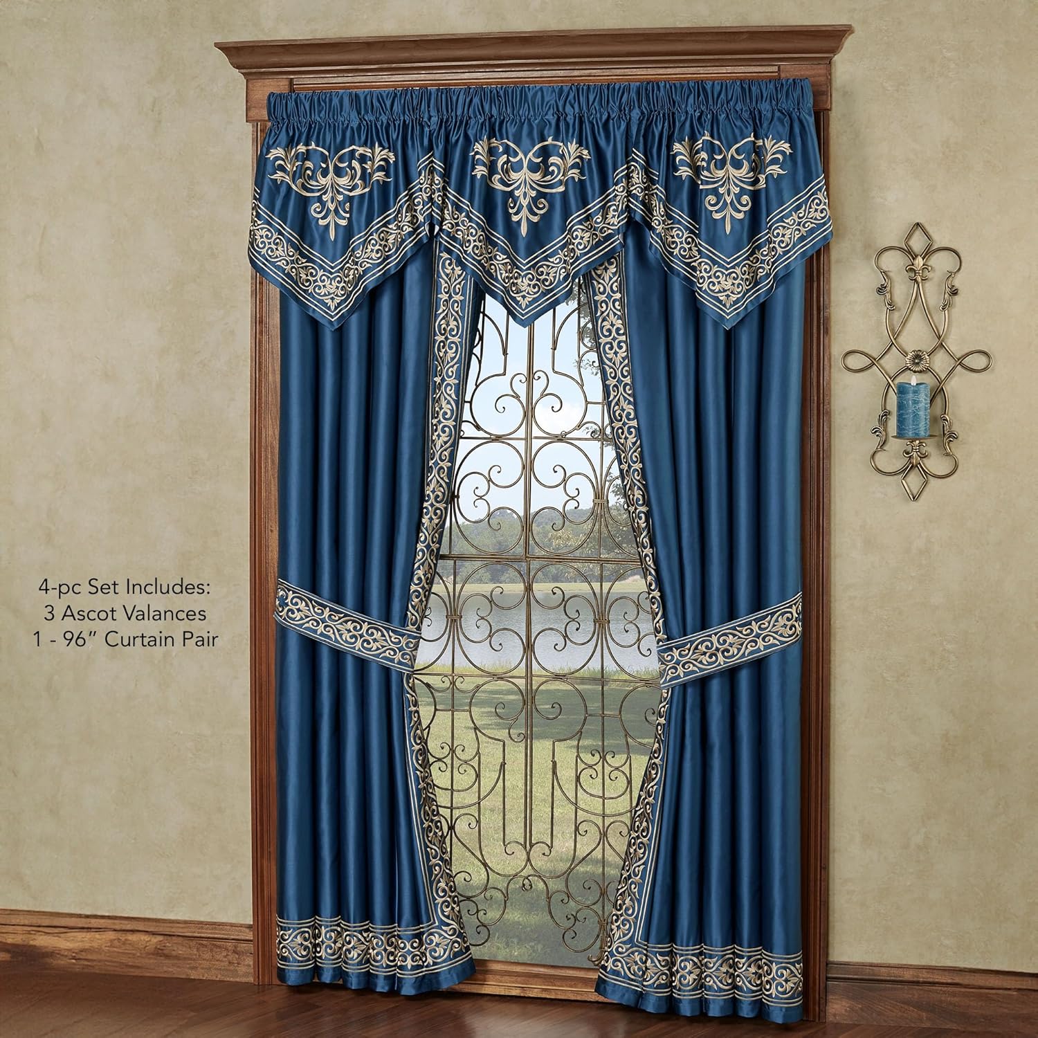 Transform your boudoir into that of an exquisite palace with the lovely Buckingham Window Treatments and its beautiful traditional style and intricate details. In beautiful polyester sateen, the luxurious sapphire blue ensemble features grandly embroidered golden scrolling filigree and defining band trim for elegant definition along each tailored bottom edge for a sophisticated look. Each lined window accent hangs via 3" rod pockets and your decorative curtain rod. Window drapery set includes three ascot valances and one curtain pair. Ascot valances also feature an embroidered swag accent. Curtain Pair also has embroidered framing designs on the inside edge; tiebacks are included. Ascot Valances measure 32"Wx22"L each. Curtain Pair measures 84"Wx96"L overall. For best results, dry clean. Imported.