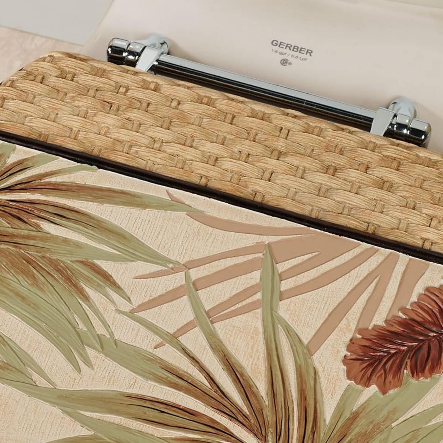 Change your scenery to the island views of Key West with this tropical elongated toilet seat. Handpainted in natural hues, the resin accent has a metallic dark copper seat sponged with black and a lid featuring a textured wheat background with dimensional leaves in russet, fern, light brown, and camel hues; a solid bronze band; and basket weave top. Chrome-plated rust-resistant metal hinges complete the design. Bolt hole distance is approx. 5.5". Overall, elongated toilet seat measures 15"Wx17"L and weighs 11 lbs. Clean with a soft, damp cloth using mild detergent. Do not use abrasive cleaners. Designed by Touch of Class(R)! Elongated size Handpainted toilet seat Lid has dimensional tropical leaves Accented with a basket weave design Metallic dark copper seat Charming tropical style Metal hinges are rust-resistant