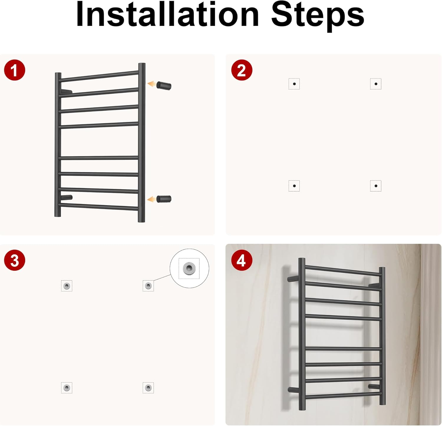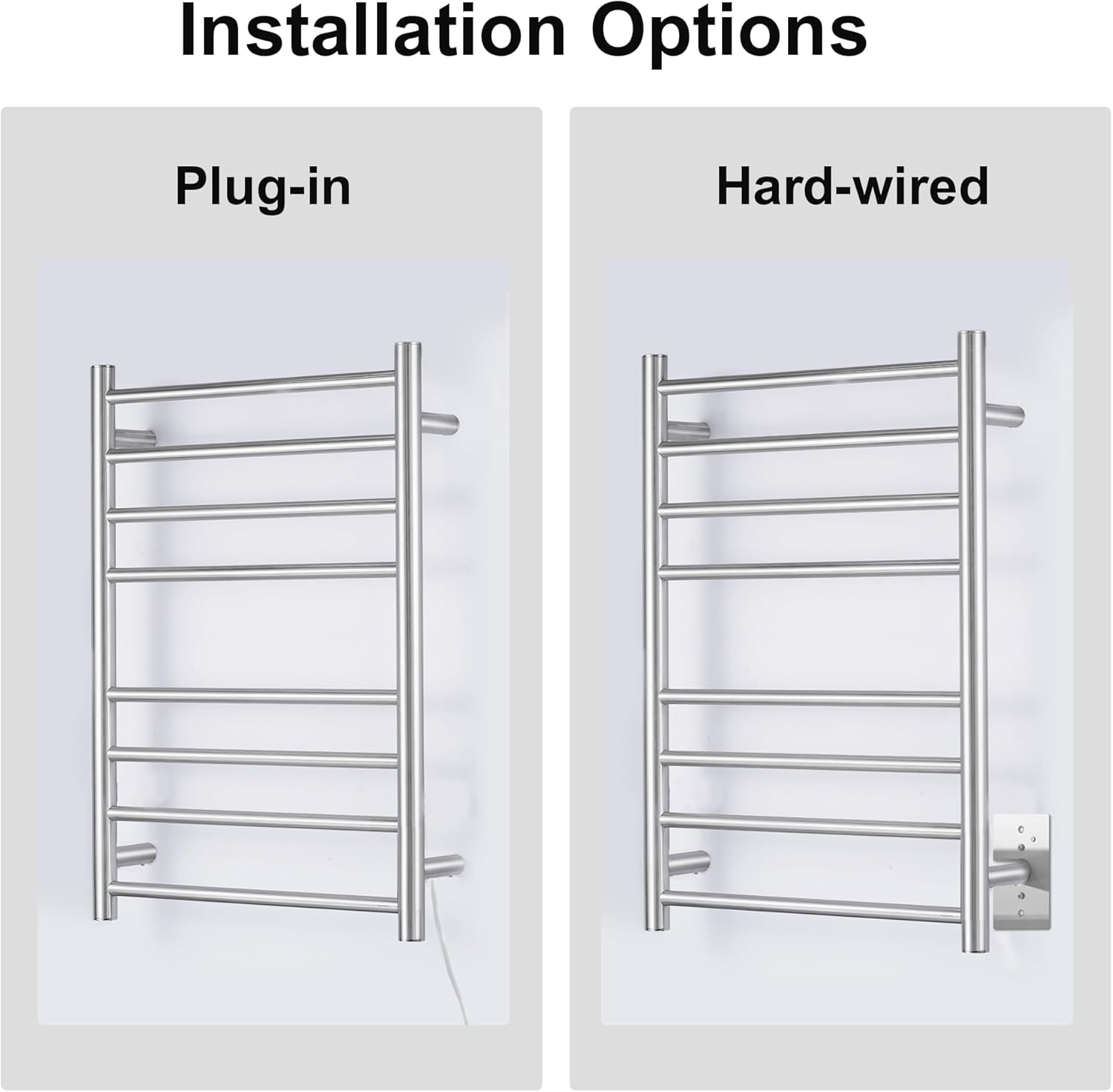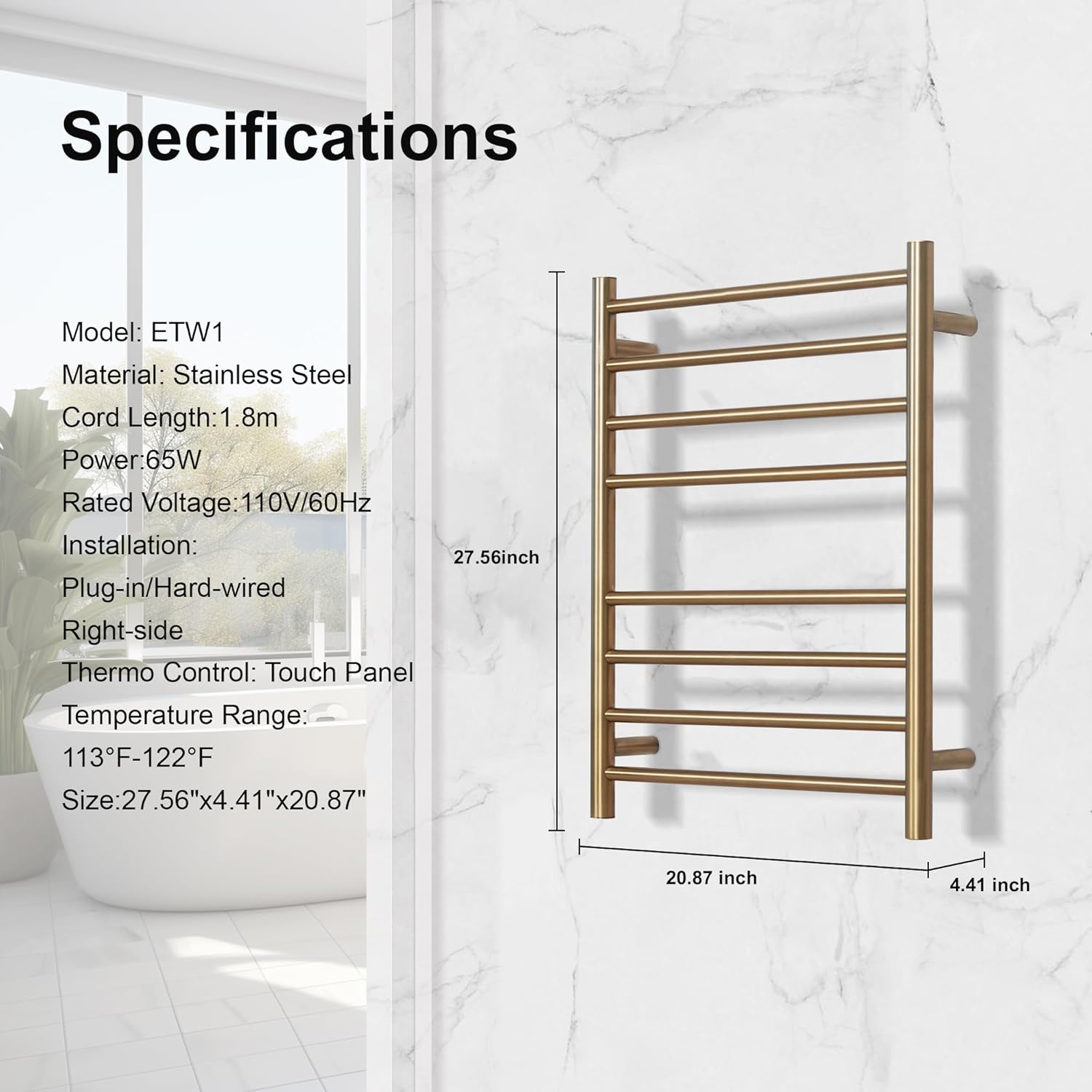Specification: Item Name: SHARNDY Wall-mounted Towel Warmer / Electric Towel Rack ETW13S Material: 201 Stainless Steel Finish: Brushed Rated Voltage: 120V, 60Hz Control Mode: Built-in Visual Temperature and Time Control Switch Temperature Adjustment: 100-140℉ Time Adjustment: ON and 1-8H Optional Installation: Wall-mounted Dimensions: H26.77" x W20.47" x D4.33" Length of the cable: 5.9 ft / 1.8 m Package Contain: 1*SHARNDY Heated Towel Rack 1*Wall-mounted Accessories 1*User Instruction ManualNote: 1. Actual optimum temperature will depend on the surrounding temperature & humidity. The material and thickness of the towel will also affect whether the towel can be dried quickly or not. 2. Due to the lighting effects and computer screen display colors differently, the color of the actual item may vary slightly from the pictures, thanks for your understanding. 3. Due to manual measurement, please allow 1-3 mm difference(1 inch = 2.54 cm). Make sure you don't mind before bidding.