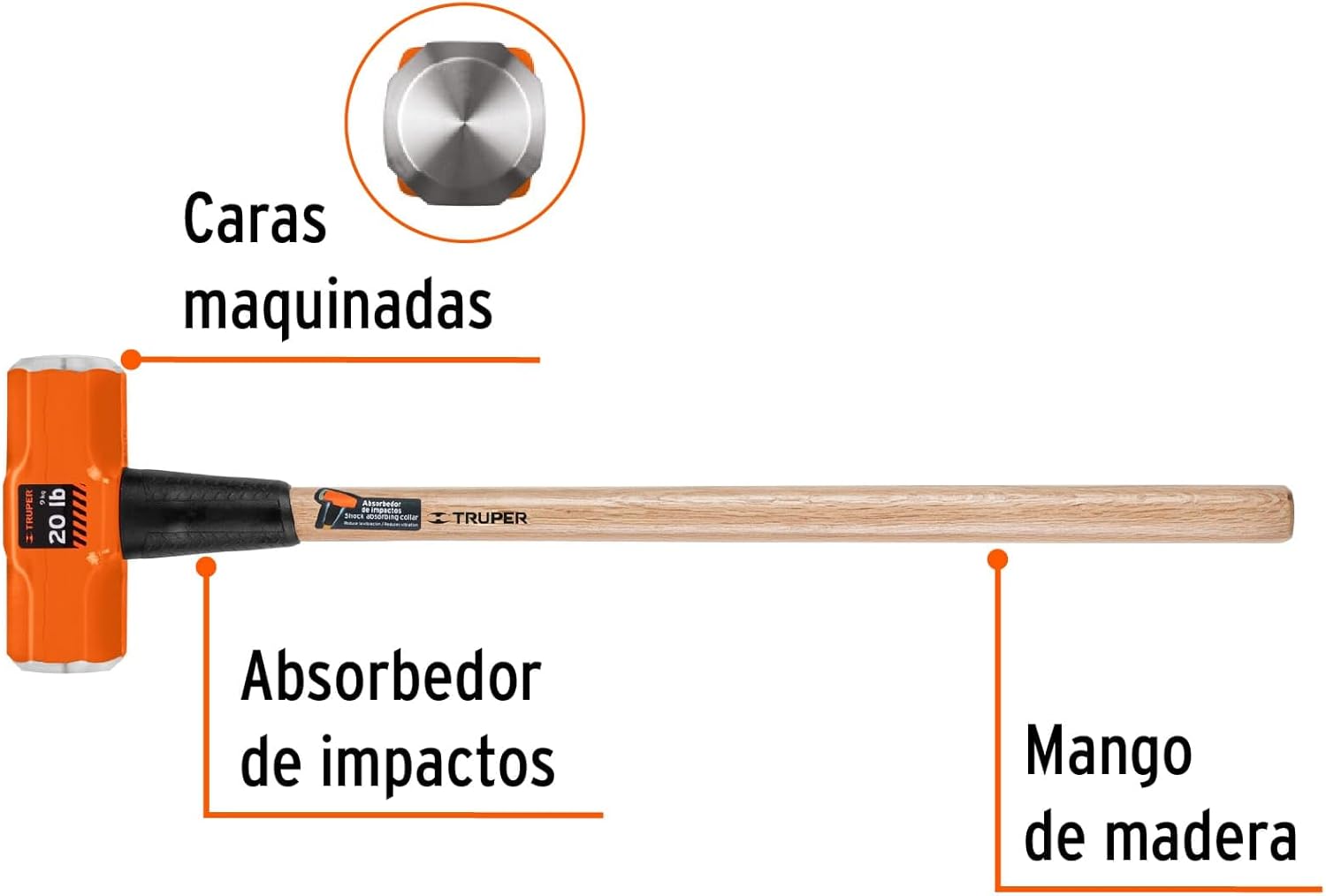 Truper MD-16M, 16 lbs octagonal hammer, 36" wooden handle - Mallet with forged steel head with machined and beveled faces - Handle made of oak wood, with shock absorber - Machined and beveled faces that reduce the possibility of accidents by Splinters - With Shock Absorber - Head 16 lbs. (7.2 kg), Handle 36" (91 cm)