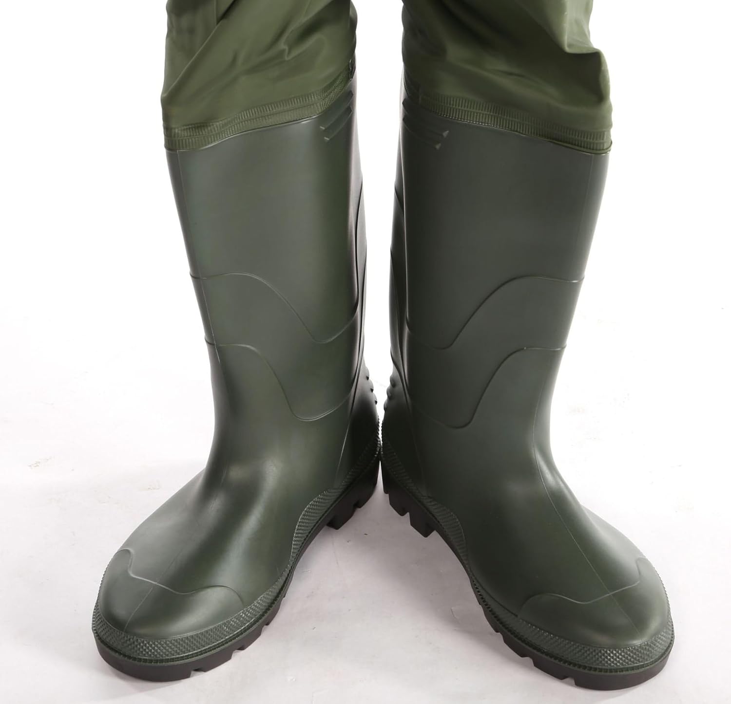 UNISTRENGH Camo Fishing Hunting Nylon and PVC Waterproof Bootfoot Chest WadersDepartment:UnisexAsian sizes, just for reference, it maybe smaller than US/UK/EU/AUstandard sizes. Please pay special attention to our US size chart below or contact us directly.Classic green camouflage color.These utility waders will keep you dry from chest to toe, Plus all seams are stitched, taped and vulcanized.Suitable for men and women. Used for duck hunting, fly fishing, gardening etc.Demension:#5.5/#6.5: Pant length--40.95'' Hips--48.82'' Crotch Depth:21.65''#7/#8/#8.5: Pant length--41.73'' Hips--50.39'' Crotch Depth:21.65''#9.5/#10: Pant length--42.91'' Hips--51.97'' Crotch Depth:21.65''#11/#12: Pant length--43.70'' Hips--53.54'' Crotch Depth:21.65''#12.5: Pant length--44.49'' Hips--55.12'' Crotch Depth:21.65''Feature:1.Adjustable suspenders with quick release buckle.2.Simple design makes getting in and out of these waders as easy as putting on pants.3.Built-in rubber boot is comfortable to worn with or without socks.4.Rugged tread pattern offers better balance and traction on wet surfaces; More grip means fewer slips and falls.5.Soft structure can be more relaxed in the activities.6.Can be quickly folded, easy to placed in the car trunk and to store.7.All-day warm, insulating pvc with taped seams keeps water out and heat in so that makes you stay comfortable on fishing or hunting trips.8.All seams are taped, glued, and stitched to protect against leaks and provide long-lasting performance.9.Easy to clean after a muddy day of funny.Customer Service:If the product is defective or damaged we will replace it.