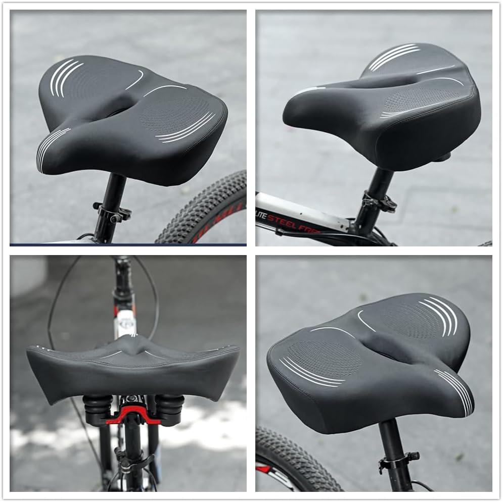 UNISTRENGH Oversized Bike Seat, Extra Wide Comfort Pure Memory Foam Bicycle Seat Cushion, Compatible Saddle Replacement with Exercise, Cruiser, Road Bike for Men & WomenSpecification:Fabric: Wear-Resistant PU LeatherMaterials: Pu Lather/Elasticity FoamSuspension: Dual- ElastomerSails: Stainless Cr-Mo SteelBottom shell: PolypropyleneProduct highlight: Ergonomics/Shock Absorption/Ventilation/ComfortableDimension:-Black-Size: 9.8*10.3*4.9 inch (L*W*H)Weight: 1.98 lb/900g-Black#02-Size: 11.81*15.35*3.54 inch (L*W*H) /30x39x9cm Weight: 2.2 lb/1000gHow to set up Easy to installIt can be installed on any standard seatpost, such as clamp ring or double rail seatpost.Fits most indoor or outdoor bikes. such as Exercise bike, beach cruiser, ebike, mountain bike, road bike...The package includes standard diameter (7/8") rail clamp, and other small tools for installation.Applicable models/types:Casual: commuter,beach cruiserExercise: spin bike, exercise bike, stationary bike, Peloton Bike & Bike+Cycling: road bike, mountain bikeAthleticsExtrs Wide Bike Saddle Feature:Triple anti-shock suspension● High elastic rubber spring shock-absorbing ball design.● Absorbs shock in both vertical and horizontal directions.● Cushioning and decompression, durable and stablePremium Waterproof leather surface● High tenacity leather is soft and comfortable● Waterproof, wear-resistant and scratch-resistant.● Even in rainy and snowy weather, you can start riding again after drying it with cloth.Hollow circulation ventilation● Say goodbye to hot and humid● Promotes air circulation to keep buttocks dry and cool.● Reduce the friction between the seat and sensitive parts, give it more care.Highly Elastic High-density Foam● Internal high-density polyurethane foam layer perfectly fits your body.● help reduce pain from your bike saddle.● It supports a maximum weight of 600 lbs.Package Included:Extra wide bike saddle*1